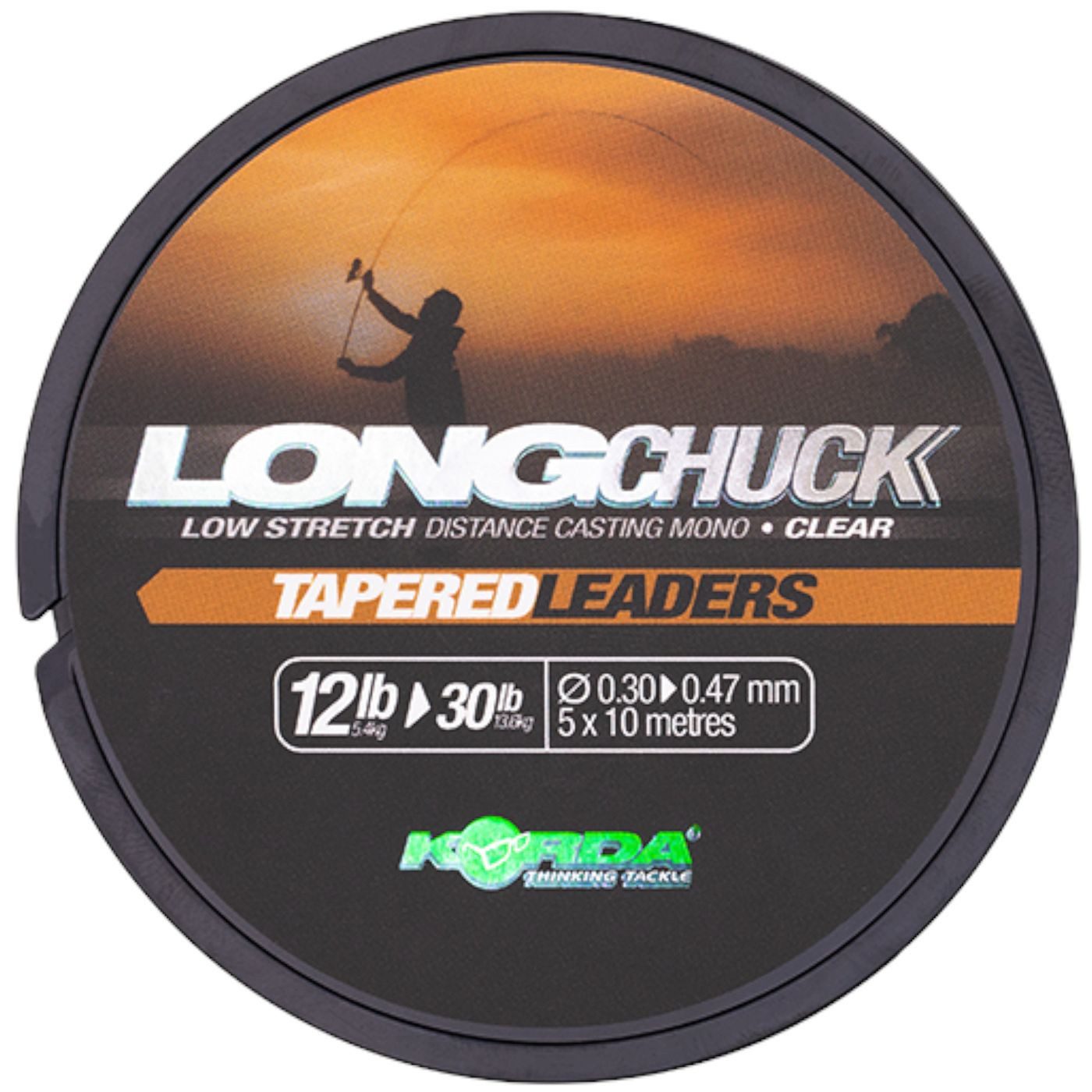 Korda LongChuck Tapered Leaders - Vorfachschnur - Die Schlagschnur von Korda bietet sehr gute Wurfeigenschaften und sie wurde zum Karpfenangeln auf große Distanzen entwickelt. Auf einer Vorfachspule befinden sich insgesamt fünf mal zehn Meter Karpfenschnur. Die ersten acht Meter sind relativ dick, wodurch die Angelschnur kraftvollen Würfen und dem Karpfenfischen an Muschelkanten und anderen Hindernissen standhalten kann. Auf den letzten zwei Metern verjüngt sich der Schnurdurchmesser. Hier wird die Schlagschnur mittels eines Verbindungsknotens an der Hauptschnur befestigt. Zusätzlich besitzt die Keulenschnur eine sehr geringe Dehnung.