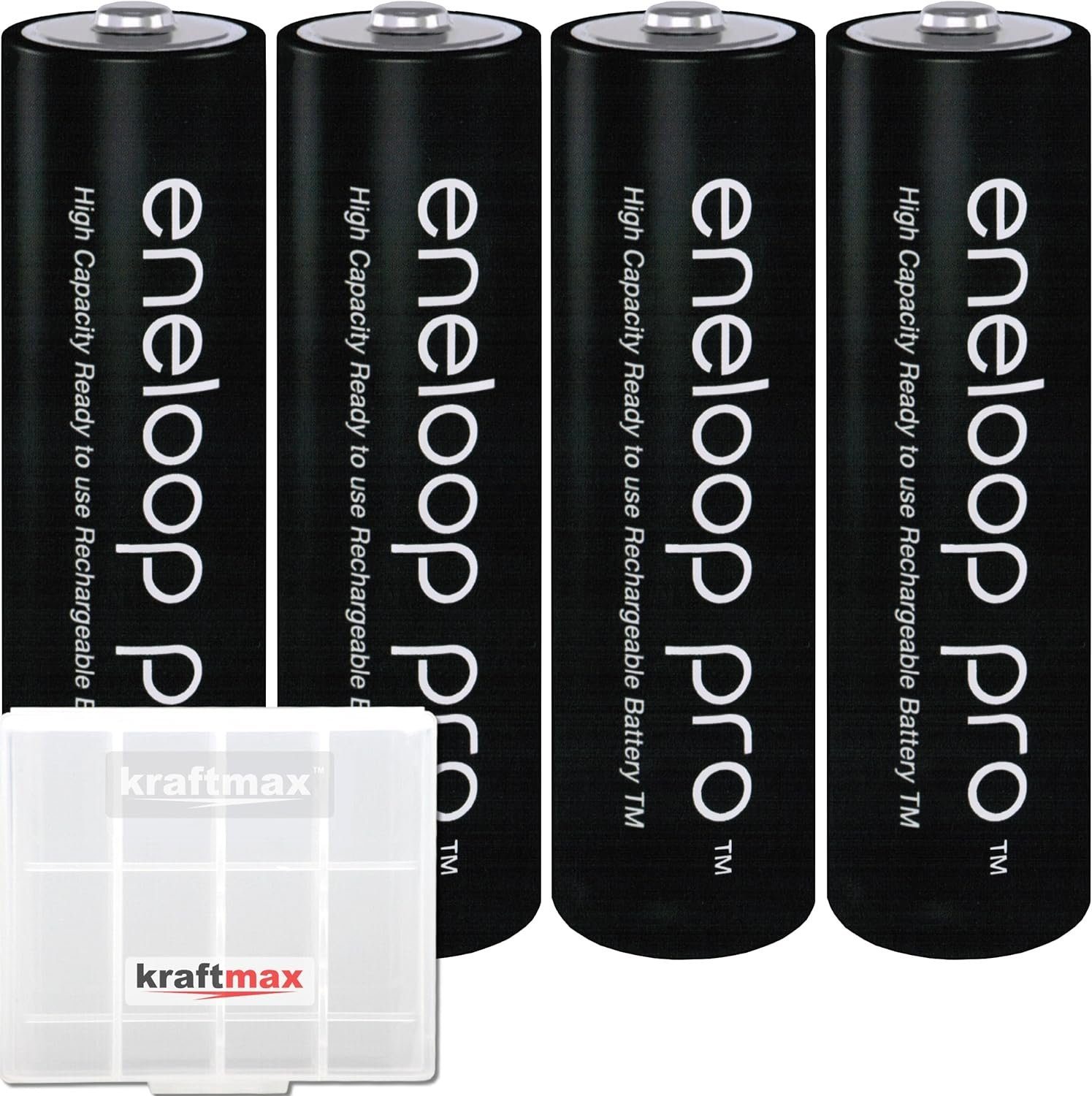 4x eneloop PRO AA Akku BK-3HCDE - Abermals verbesserte allerneueste Generation des erfolgreichen high-capacity "eneloop Double X". Jetzt von Panasonic. eneloop PRO ist DER Panasonic Hochleistungs-Akku. Jetzt als AA mit einer typischen Kapazität von 2550 mAh! eneloop PRO Akkus sind die perfekte Wahl für Geräte mit hohem Energieverbrauch, wie beispielsweise Digitalkameras, kabellose Computertastaturen, Computer-Mäuse, Gamepads, Spielzeuge, Modellbau etc. Fast alle batteriebetriebenen Haushaltsgeräte können eine bessere Leistung erbringen, wenn sie mit eneloop PRO verwendet werden. Sofort einsatzbereit: Wiederaufladbare Batterien haben üblicherweise die Eigenschaft, sich selbst zu entladen, was ihre geladene Energie nach und nach verringert. eneloop-Akkus hingegen haben nur eine geringe Selbstentladung und kommen darum bereits vorgeladen in den Handel, so dass sie ganz wie Einweg-Batterien gleich nach dem Kauf eingesetzt werden können. Die Verwendung der von SANYO entwickelten Superkristallgitter-Legierung für die Kathode und die Verbesserung der Materialien und der Struktur ermöglichen es, dass ein voll aufgeladener Akku der allerneuesten, nochmals verbesserten eneloop Generation auch nach 1 Jahr Lagerung noch bis zu 85% seiner ursprünglichen Ladung aufweist. Im Lieferumfang enthalten: Praktische Kraftmax Aufbewahrungsbox: Die Akkubox von Kraftmax schützt 1-4 Akkus oder Batterien des Typs Mignon (AA) oder Micro (AAA) vor ungewollter Entladung und anderen Einwirkungen. Sie ist ein praktisches Zubehör für unterwegs und ein optimaler Aufbewahrungsort für zu Hause.