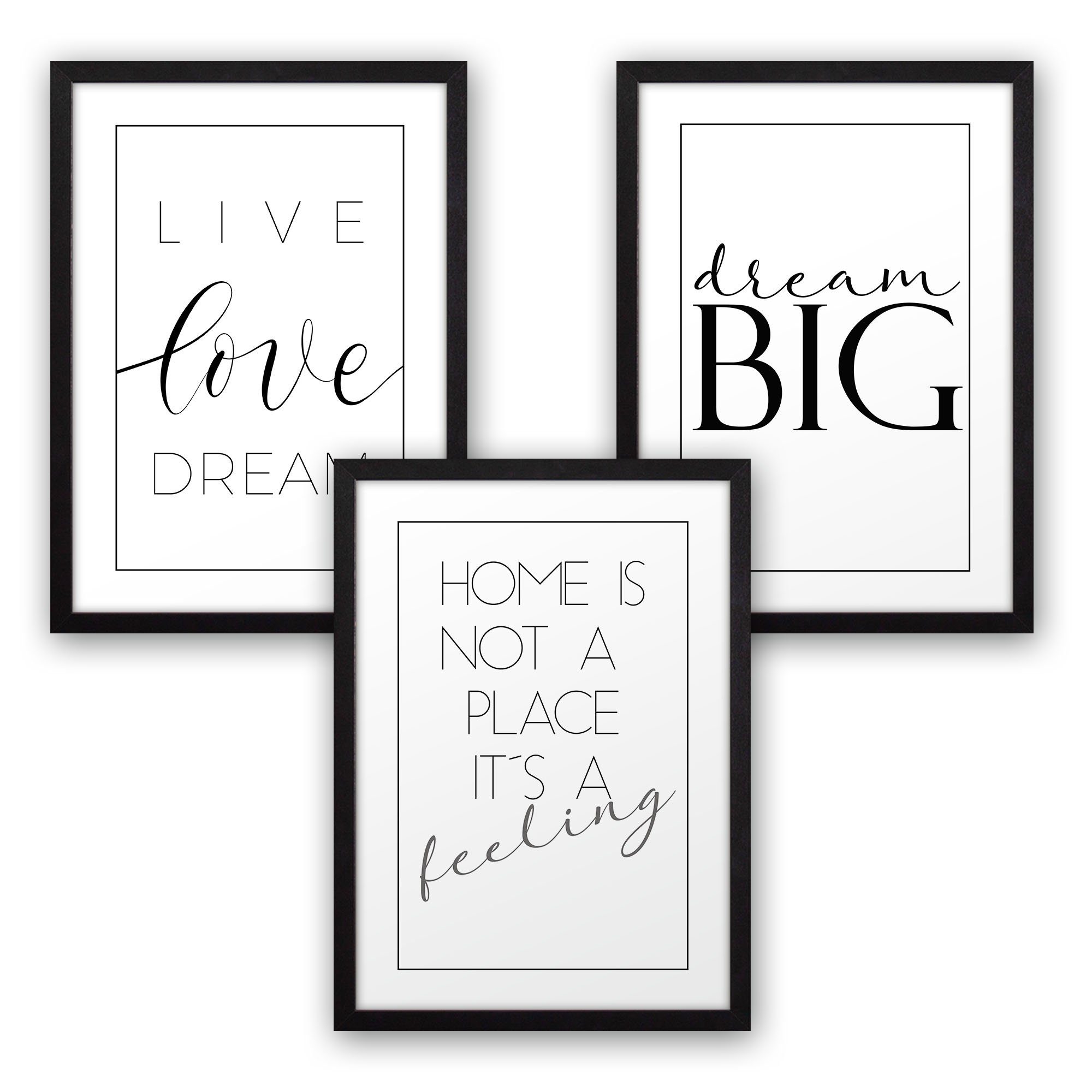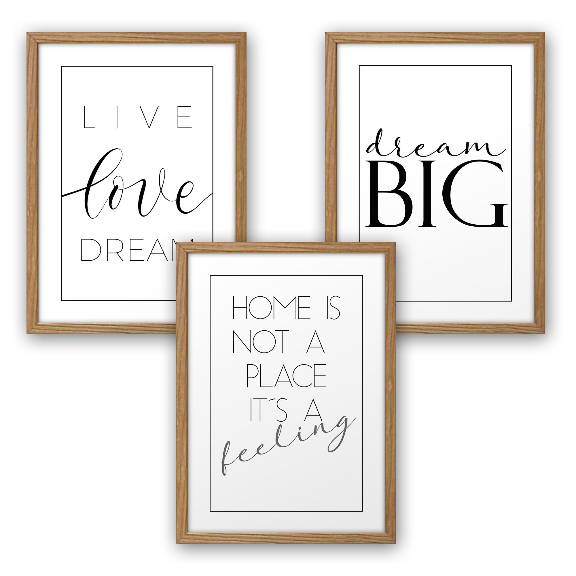 Wohne mal anders! Schluss mit langweiliger Wanddeko! Mit unserem stilvollen Poster-Set hebst du dich ab. Die Motive sind aufeinander abgestimmt und verleihen jedem Raum das gewisse Etwas. Wir legen Wert auf hohe Qualität: Unsere Kunstdrucke mit brillanten Farben werden ausschließlich auf hochwertigem 250g/m² schwerem Qualitätspapier gedruckt, damit Sie lange Freude an Ihrem Wandbild haben und dieses ein einzigartiges Flair in die Wohnung bringt. Mit diesem Qualitätsprodukt kaufen Sie auch "Made in Germany". Die 3 Poster sind im DIN A4 oder DIN A3 Format und werden wahlweise mit Rahmen geliefert. Nutzen Sie Ihre gewünschten Bilderrahmen ganz individuell und passend zu Ihrer Einrichtung. Natürlich können mehrere Bilder auch nach Lust und Laune kombiniert werden. Nutzen Sie unsere vielfältige Auswahl, um eine ganz persönliche Bilderwand zu zaubern. Unsere Poster sind die perfekte Deko für Ihr Wohnzimmer, Flur, Diele, Küche, Büro oder Schlafzimmer und ebenso eine ausgefallene Geschenkidee. Viele der Motive können gut kombiniert werden.