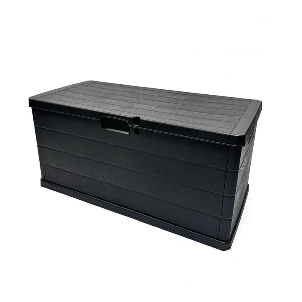 Die Kreher XXL Kissenbox / Gartenbox in moderner Holz Optik mit einem beeindruckenden Volumen von 340 Litern ist die ideale Lösung für all Ihre Aufbewahrungsbedürfnisse im Garten. In elegantem Anthrazit gehalten, fügt sich diese vielseitige Box harmonisch in jede Umgebung ein und bietet sowohl Funktionalität als auch Stil.Mit Außenmaßen von ca. 118 x 59 x 57 cm bietet die Kreher Kissenbox großzügigen Stauraum für Kissen, Auflagen und andere Gartenutensilien. Hergestellt mit viel Materialeinsatz, überzeugt sie durch ihre robuste Bauweise und Langlebigkeit. Zudem dient sie auch als stabile Sitzbank mit einer Tragfähigkeit von bis zu 90 kg, was sie zum perfekten Begleiter für gesellige Abende im Freien oder entspannte Momente im Garten macht.Dank ihrer praktischen Rollen ist die Box leicht zu bewegen und kann flexibel an verschiedenen Orten genutzt werden. Die abschließbare Konstruktion (Schloss nicht enthalten) sorgt für zusätzliche Sicherheit, sodass Ihre Gegenstände stets geschützt sind.Die Kreher Kissenbox ist nicht nur optisch ein Highlight, sondern auch äußerst pflegeleicht. Sie ist UV- und witterungsbeständig sowie frostbeständig, was sie besonders langlebig und widerstandsfähig gegenüber den Elementen macht. Zudem ist sie abwaschbar und leicht zu reinigen, sodass sie immer in einwandfreiem Zustand bleibt.Mit ihrer modernen Holz Optik und dem großzügigen Volumen von 340 Litern bietet die Kreher XXL Kissenbox / Gartenbox eine elegante und praktische Lösung für Ihre Aufbewahrungs- und Sitzbedürfnisse im Außenbereich. Gönnen Sie sich dieses vielseitige und stilvolle Möbelstück und genießen Sie die perfekte Kombination aus Funktionalität und Design in Ihrem Garten.