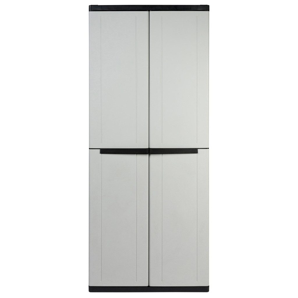 Toller Kunststoffschrank | Haushaltsschrank | Werkstattschrank aus robustem Kunststoff (PP) in der Farbkombination aus grauem Korpus und schwarzen Accessoires. Der Kunststoffschrank ist insbesondere gut geeignet für den Einsatz in Haushalt, Keller und Garage. Auch in überdachten und Wind-geschützten Außenbereichen kann er Einsatz finden. Die Montage ist dank simplem Stecksystem und übersichtlicher Aufbauanleitung binnen weniger Minuten vollzogen.  Der Haushaltsschrank ist ausgestattet mit drei höhenverstellbaren Einlegeböden. Die Einlegeböden sind belastbar mit bis zu 20 kg bei gleichmäßiger Verteilung der Traglast.  Die Optik des Schranks ist dezent und schlicht gehalten. So passt sich der Kunststoffschrank optisch in nahezu jeden Bereich ein und wirkt dezent und nicht aufdringlich. Die beiden Türen verfügen ferner über zwei Griffe, die mittels einer Öffnung versehen ist und mit Hilfe derer die Türen mittels Gabelschloss verschlossen werden können. Das Schloss ist im Lieferumfang nicht inbegriffen. Das robuste Kunststoffmaterial ist einfach in der Pflege. Daher lässt es sich auch prima in Räumen einsetzen, die eine hohe Luftfeuchtigkeit aufweisen oder in denen es auch einmal nass werden kann, wie z.B. Kellerräume, u.a. Mit einem haushaltsüblichen Reiniger und/ oder einem Schwamm mit etwas Wasser haben Sie den Schrank jederzeit im Handumdrehen gereinigt. Durch das schnörkellose Design setzt sich auch kein Staub und Dreck an den Fronten ab.