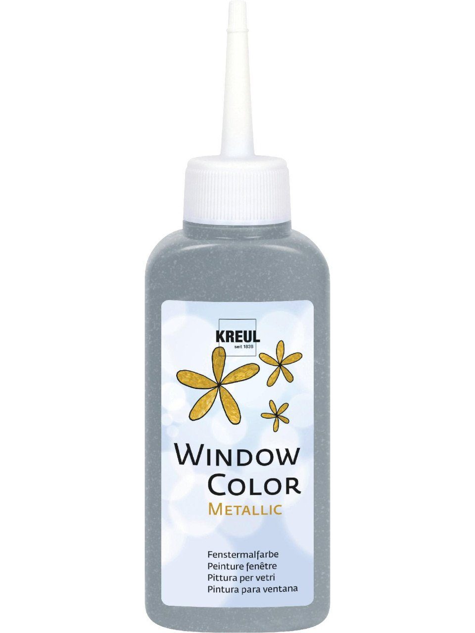 Produktdetails: Farbe: silber | Menge: 80 ml | Auf Wasserbasis | Farbton schimmert metallisch | Fensterbilder lassen sich einfach rückstandslos wieder abziehen | Flasche mit feiner Malspitze |