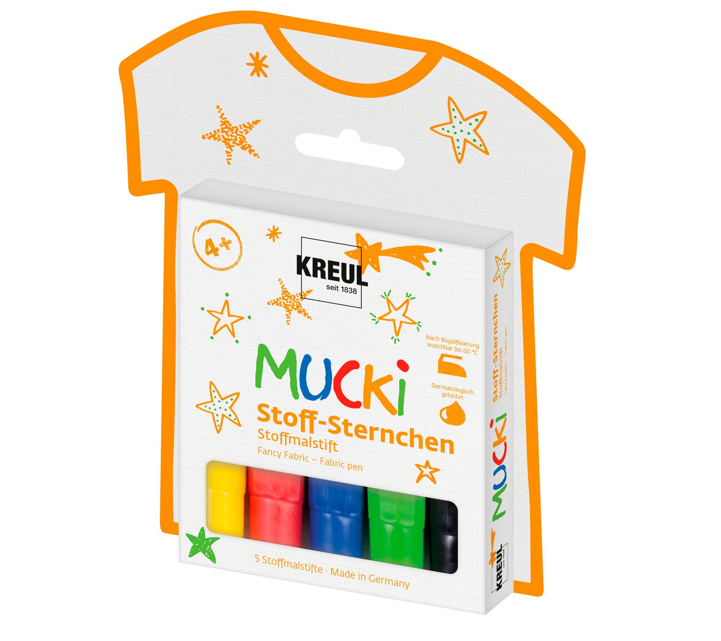 Diese Mucki Stoff-Sternchen Stoffmalstifte im 5er-Set in Gelb, Rot, Blau, Grün und Schwarz haben eine Strichstärke von ca. 2-5 mm. Hervorragend geeignet für die Bemalung von hellen Textilien aus Baumwolle, Leinen und Baumwollmischgewebe. Als Vorbereitung sollten die Textilien vor dem Bemalen gewaschen werden. Nach der Bemalung und dem Trocknen wird durch 5 Minuten Bügeln fixiert. Anschließend sind die Textilien lichtecht und waschbeständig auf links bis 60 °C. Ein Set mit kurzen, handlichen Stiften und mit einer robusten Spitze. Das richtige für Kinderhände um schöne Textilien zu bemalen.