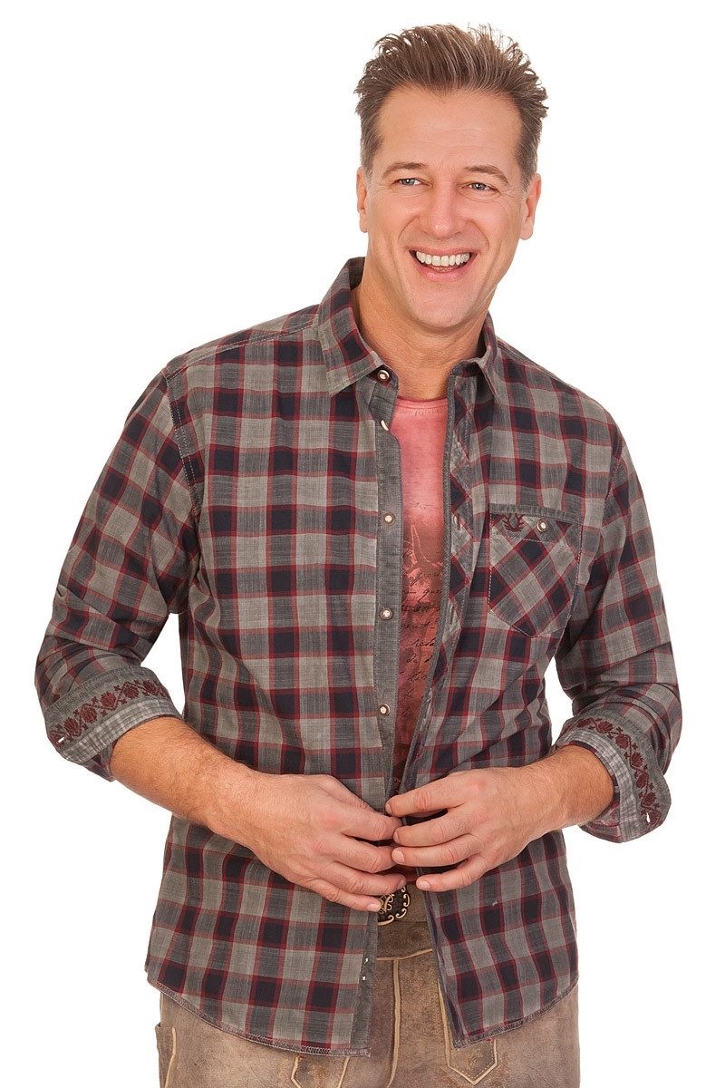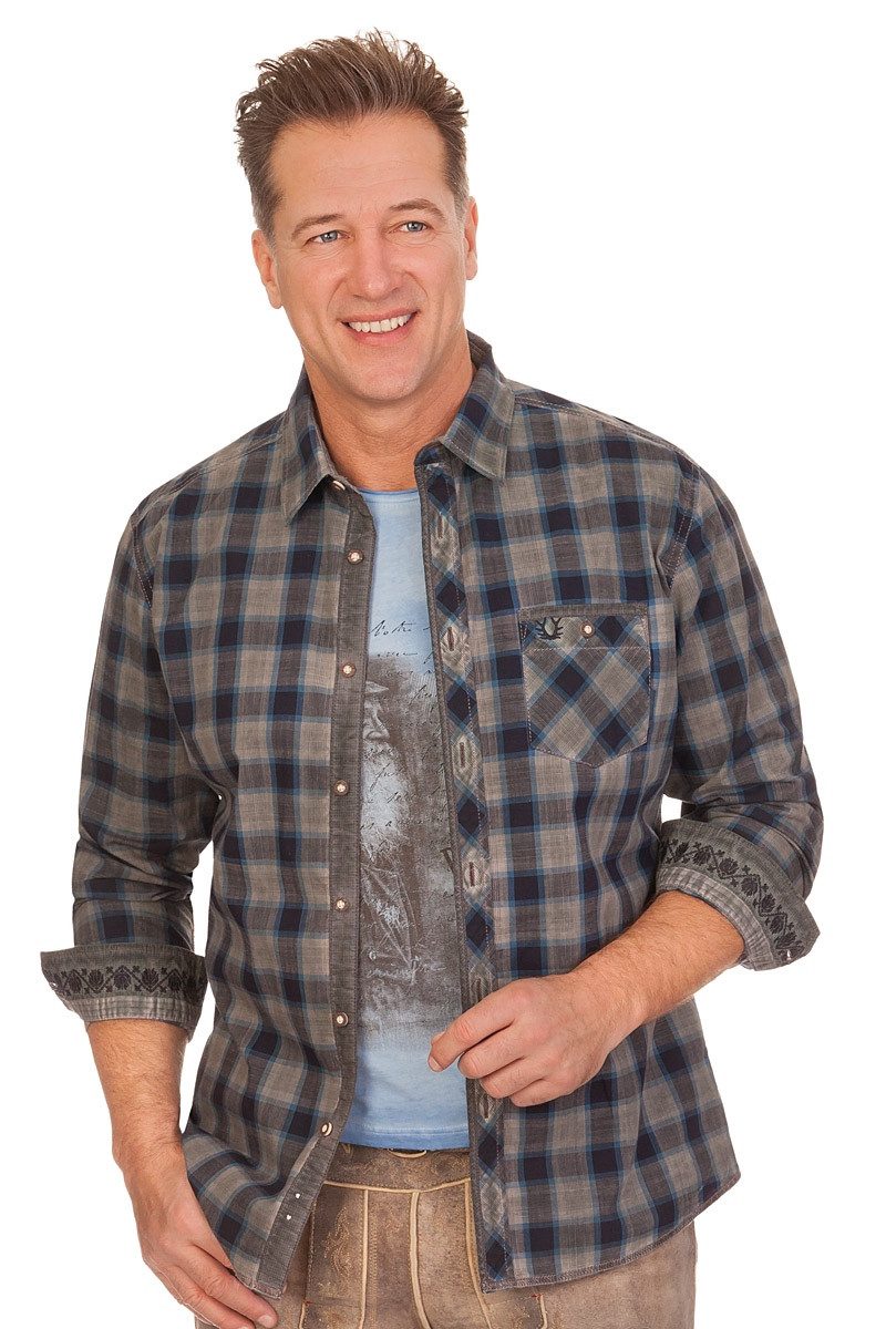 Das modische langarm Trachtenhemd Fabian mit Kentkragen besteht aus reiner Baumwolle und hat ein fesches, zeitloses Karo-Webmuster in Tartan-Art, bei dem schöne Grau-Töne mit stylischen Farbakzenten kombiniert werden. Der Oberkragen unten sowie der Kragensteg innen sind mit Kontraststoff verstärkt, ebenso die Knopfleiste. Die Knopflochleiste ziert - genau wie die aufgesetzte Brusttasche links - 45° zum Karohemd gedrehter Stoff und eine Kontrastpaspel. Ein Knopf und eine Geweih-Stickerei an der Brusttasche dienen zusätzlich als Schmuckelemente. Die Knöpfe haben eine stilisierte Hirschhorn-Optik. Die Ellenbogen-Bereiche an den Ärmeln sind mit Kontraststoff-Patches verstärkt. Zweierlei Kontraststoffe, einer davon grandios floral bestickt, sind innen an den abgeschrägten und weitenverstellbaren Manschetten angebracht. Die Ärmelschlitze sind ebenfalls verstärkt und mit einem Knopf versehen. Der Nackenbereich besteht aus 45° gedrehtem Stoff. Das Highlight des Herrenhemds ist ein großer, herrlicher Rücken-Print mit Wappen, floralen Elementen und einem springenden Hirsch, ergänzt mit handschriftlichen Textteilen und veredelt mit einem Marken-Gründungsjahr-Stick. Der Saum ist leicht gewölbt und mit einer Ziernaht hervorgehoben. Das Material und der bequeme Perfect fit-Schnitt bieten einen super Tragekomfort. Die geschmackvolle Kreation aus dem Hause Krüger Buam passt super zur Lederhose und Trachtenjeans. Bitte beachten Sie den Übergrößenzuschlag bei Размер 4XL