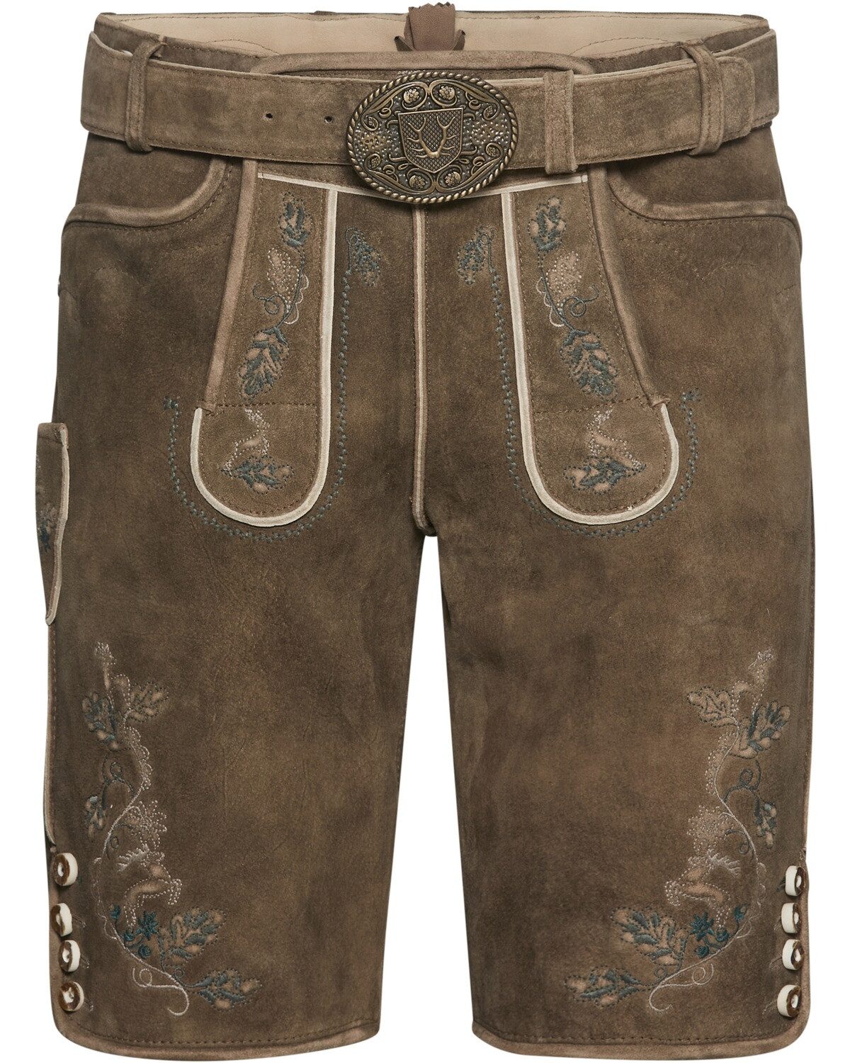 Die Herren Trachtenlederhose von Krüger Buam verkörpert zeitlose Tradition und hohe Qualität. Hergestellt aus edlem Ziegenveloursleder, bietet sie nicht nur eine angenehme Haptik, sondern auch eine bemerkenswerte Langlebigkeit. Die kunstvollen traditionellen Stickereien setzen dekorative Akzente und verleihen der Hose einen authentischen Charakter, der in der Trachtenmode geschätzt wird. Praktische Details wie die Schubtaschen, die Messertasche und die Gesäßtasche sorgen für ausreichend Stauraum und Funktionalität, während die Schnürung am rückseitigen Bund für einen individuellen Sitz sorgt. Die Knöpfe an den Beinenden runden das Design harmonisch ab und tragen zur traditionellen Ausstrahlung der Lederhose bei. Diese durchdachten Elemente machen die Trachtenlederhose nicht nur zu einem stilvollen Kleidungsstück, sondern auch zu einem praktischen Begleiter für verschiedene Anlässe. Ein weiterer Pluspunkt ist der im Lieferumfang enthaltene Gürtel mit Koppelschließe, der das Gesamtbild perfekt abrundet. Diese Trachtenlederhose ist ideal für festliche Anlässe, Volksfeste oder gesellige Zusammenkünfte und bietet sowohl Komfort als auch Stil. Mit ihrem klassischen Design und der hochwertigen Verarbeitung ist sie eine wertvolle Ergänzung für jede Trachtengarderobe. Oberstoff: 100% Leder. Hinweis zur Passform: Bitte beachten Sie, dass die Hose bei der Anprobe zugehen muss, jedoch nicht bequem sitzen soll. Denn wenn sie schon bei der Anprobe bequem ist, wird sie nach mehrmaligem tragen zu groß sein! Leder ist ein Naturprodukt - so weitet sich die komplette Hose beim Tragen noch.