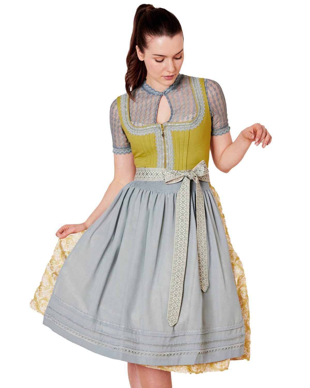 Elegantes Dirndl Josefine im klassischem Stil wird dein Trachtenherz im Sturm erobern. Das Mieder ist schlicht in einem gelb mit grauer Spitze gehalten und wird vorne mit einem Reißverschluss geschlossen. Mit dem floral schimmernde Muster am Rock schafft das Dirndl einen stilvollen Look, der durch zwei praktische Eingriffstaschen ergänzt wird. Dank der taillierten Passform betont das Dirndl vorteilhaft deine Figur. Mit einer Rocklänge von 70cm endet es elegant unter dem Knie und schafft einen eleganten Auftritt. Der praktische Reißverschluss vorne ermöglicht ein leichtes An- und Ausziehen. Der ärmellose Schnitt und der gerade Ausschnitt lassen Raum für kreative Accessoires. Die schlichte Schürze rundet das Gesamtbild ab. Ein wahrhaftiges Highlight aus der Krüger COLLECTION Kollektion! Ein sehr schönes Dirndl für Damen, Qualität und Design werden Sie ganz sicher begeistern. Das Dirndl ist besonders schön für Hochzeiten und festliche Anlässe, aber auch für Ihren nächsten Besuch beim Oktoberfest oder Volksfest sind Sie damit perfekt gekleidet.