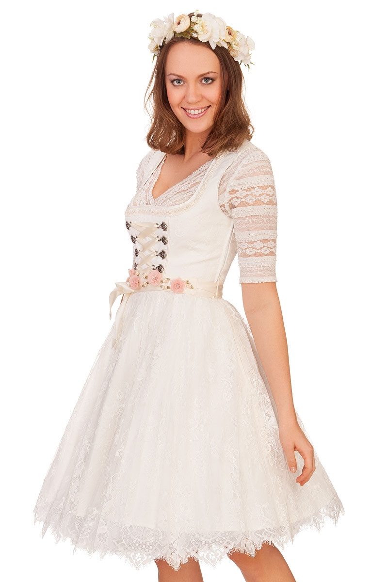 Dieses edle Hochzeitsdirndl Samira in Midi-Длина ist ein märchenhafter Hochzeitstraum. Das Mieder besteht aus glänzendem Taft und hat allover einen zarten, floralen Spitzenbesatz. Der verführerische, gerade Ausschnitt ist sauber umsäumt und von teils mit Perlen besetzten Posamentenborten umrahmt. Die traumhaften, altsilbernen Miederhaken sind mit Strasssteinen besetzt und halten das elegante Satinschnürband. Sowohl Teilungsnähte als auch Armausschnitte sind schön abgepaspelt. Auf der linken Seite befindet sich ein Reißverschluss mit kleinem Zipper. Der zweilagige Rock besteht aus einem dezent schimmerndem Taft-Unterrock in A-Linie und darüber aus einem zarten, floralen Spitzenrock, der in kleine Kellerfalten gelegt ist. Der Saum des Spitzenrocks ist wellenförmig abgeschlossen. Ein bezauberndes, breites Blütenband aus feinem Satin dient als Bindegürtel, deren Schleife vorn oder rückseitig gebunden werden kann. Vorn ist der Gürtel prachtvoll mit zweierlei Blüten aus Tüll und Satin im 3D-Stil besetzt. Das fantastische Trachtenkleid im romantischen Design stammt von der Marke Krüger Collection. Bei Размер 48 beachten Sie bitte den Übergrößenzuschlag. Im Lieferumfang ist das Midi Dirndl mit Bindegürtel enthalten; Bluse und Petticoat sind nicht inbegriffen.