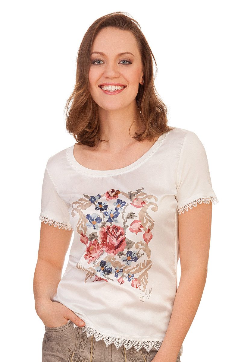 Das bezaubernde, tailliert geschnittene Trachtenshirt Bianca mit weitem Rundhals-Ausschnitt von der Marke Krüger Madl zeigt sich als romantisches Glanzstück. Die Vorderseite aus seidig schimmernder, weich fließender Viskose ist mit einer wundervollen Blumen-Komposition im Vintage-Look nach Art einer Kreuzstich-Stickvorlage bedruckt und für schöne Akzente teilweise bestickt. Die kurzen Ärmel sind an den Bündchen mit einer fantastischen, blumigen Spitzenborte verziert und der vordere Saum ist mit einer Paspel sowie einer Spitzenborte in Herz-Form veredelt. Die Seiten sind unten geschlitzt. Der etwas längere Rücken besteht aus feinem Shirt-Material. Durch den Stretch-Anteil ergibt sich eine bequeme Passform. Dieser verträumte Style passt perfekt zu unseren Lederhosen, Trachtenjeans und Trachtenröcken.