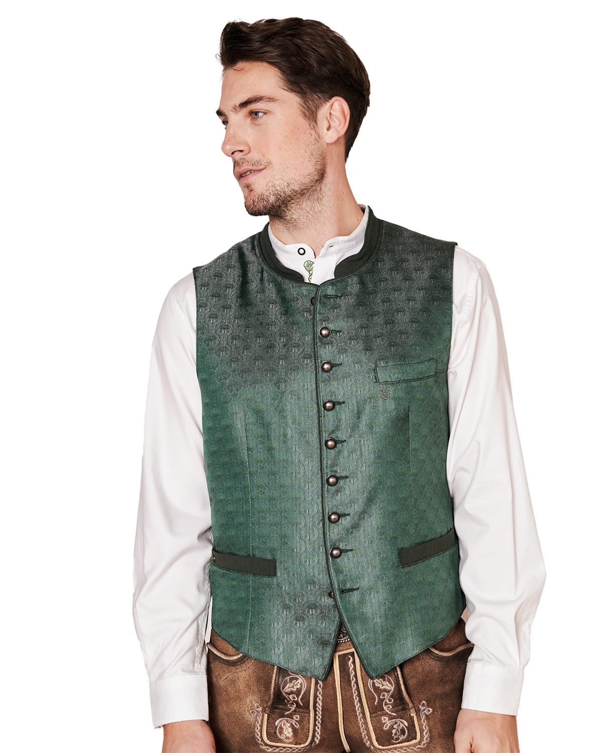 Diese schöne Herren Trachtenweste vom deutschen Hersteller Krüger ist ein echter Hingucker und ergänzt perfekt das Trachtenoutfit. Die Herrenweste hat einen eleganten Look, sie wird mit silbernen Zierknöpfen geschlossen und farblich abgesetzte Paspeln setzen zusätzlich Akzente. Die Frontseite ist aus einem leicht glänzenden, grünen Stoff mit feinem Muster hergestellt, die Rückseite aus einem glatten Material. Die Weite lässt sich über einen Querriegel im Rücken individuell anpassen. Der kleine Stehkragen und die Knöpfe in Altsilber unterstreichen den trachtigen Charakter der Weste perfekt und lassen diese sowohl modern, als auch traditionell wirken. Wer moderne Tradition, Hochwertigkeit und Detailverliebtheit schätzt, für den dürfte diese Trachtenweste genau das Richtige sein. Zu Lederhose, Trachtenoutfit und auch zur Jeans getragen, geben Sie mit der Weste stets ein tolles Bild ab und Sie sind für Oktoberfest, festliche Anlässe und Hochzeiten perfekt gerüstet.