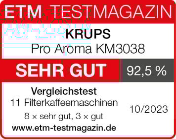 Die KRUPS Pro Aroma KM3038 erzielt im Vergleichstest des „ETM TESTMAGAZINS“ mit zehn weiteren Filterkaffeemaschinen das Gesamtergebnis „sehr gut (92,5 %)“. Die „sehr gute“ Funktionalität überzeugt u. a. mit einer „sehr guten“ Temperatur nach dem Brühvorgang. Das Gerät ist sehr leicht zu handhaben und „gut“ verarbeitet. Außerdem punktet der sehr geringe Stromverbrauch. Insgesamt gehört das Modell zum mittleren Bereich des starken Testspektrums.