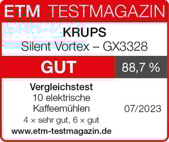 Die KRUPS Silent Vortex – GX3328 erzielt im Vergleichstest des „ETM TESTMAGAZINS“ mit neun weiteren elektrischen Kaffeemühlen das Gesamtergebnis „gut (88,7 %)“. Das Gerät ist einfach zu bedienen und zu reinigen. Die „gute“ Leistung überzeugt u. a. mit „guter“ Mahlgleichmäßigkeit und sehr hoher Geschwindigkeit. Die Kaffeemühle arbeitet besonders leise. Außerdem punktet die hochwertige Verarbeitung. Insgesamt gehört das Modell zum hinteren Bereich des starken Testspektrums.
