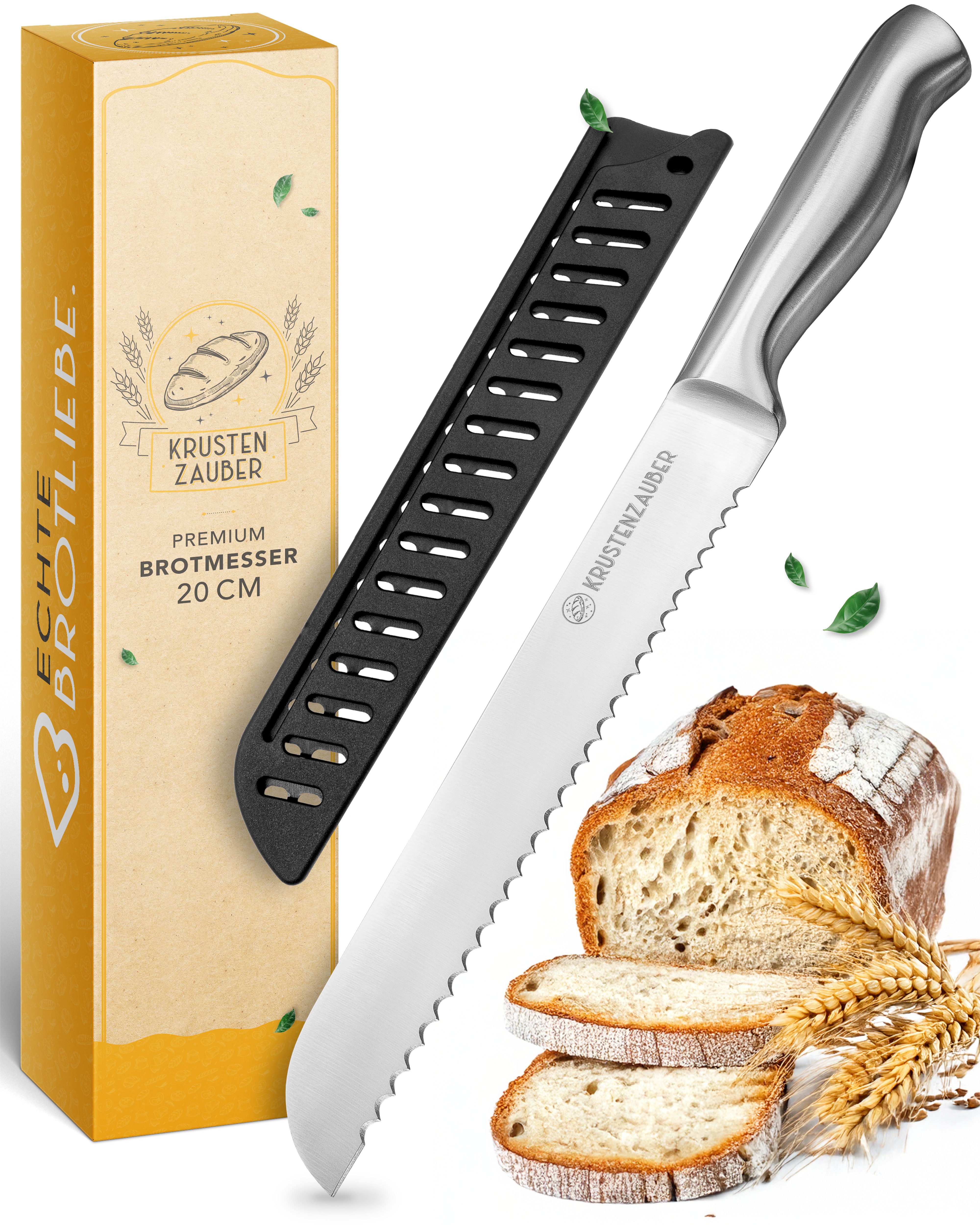 Das KRUSTENZAUBER Brotmesser ist in mehreren Вариантыn erhältlich – mit 20 cm Klinge für handliche Brötchen, Baguettes und kleinere Brote sowie mit 26 cm Klinge für große Laibe, Sauerteig oder knusprige Vollkornbrote. Die scharfe Edelstahlklinge sorgt für sauberes Schneiden durch harte Krusten und weiches Inneres, ohne das Brot zu zerdrücken. Gefertigt aus rostfreiem Edelstahl, überzeugt das Messer durch Langlebigkeit, hygienische Reinigung und eine dauerhaft zuverlässige Schneide. Ob als Brotmesser, Brotsäge oder Küchenmesser – das KRUSTENZAUBER Messer ist vielseitig einsetzbar und ein unverzichtbares Werkzeug in jeder Küche. Mit seinem ergonomischen Griff liegt es angenehm in der Hand und bietet auch bei längerem Schneiden maximale Kontrolle und Komfort – ideal für Hobbybäcker und Profis. Das zeitlose Design und die präzise Verarbeitung machen das Brotmesser zum perfekten Begleiter beim Schneiden von Baguette, Ciabatta, Vollkorn- oder Sauerteigbrot.