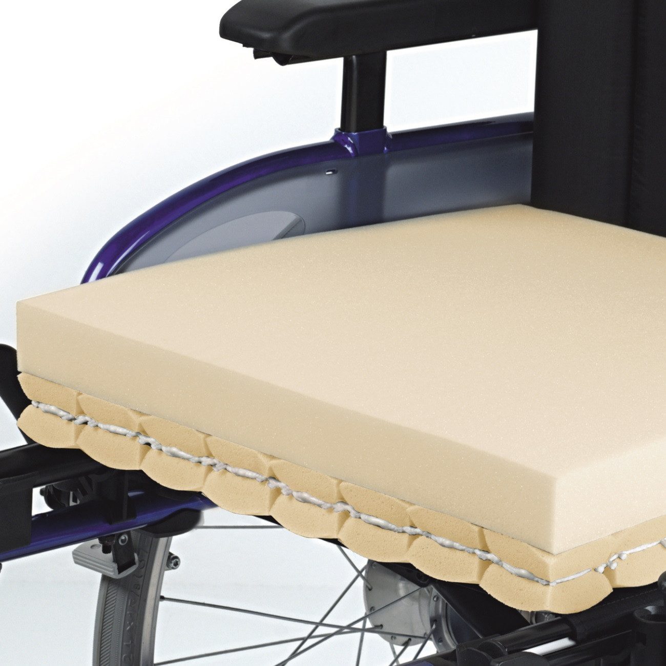 Das Rollstuhlkissen Kubivent Thera-Visco besteht aus in einem Gitternetz eingehängten Würfeln und einer viscoelastischen Platte. Das viscoelastische Material reagiert auf Körperwärme und -gewicht und passt sich durch Einsinken ideal dem Nutzer an. Auf der Unterseite lassen sich einzelne oder mehrere Würfel je nach Gewicht und Bedarf zur individiduellen Anpassung entsprechend entfernen. Dieses Kissen gewährleistet eine gleichmäßige Druckverteilung auch unter höchster Belastung und sorgt gleichzeitig für ein optimales Mikroklima.