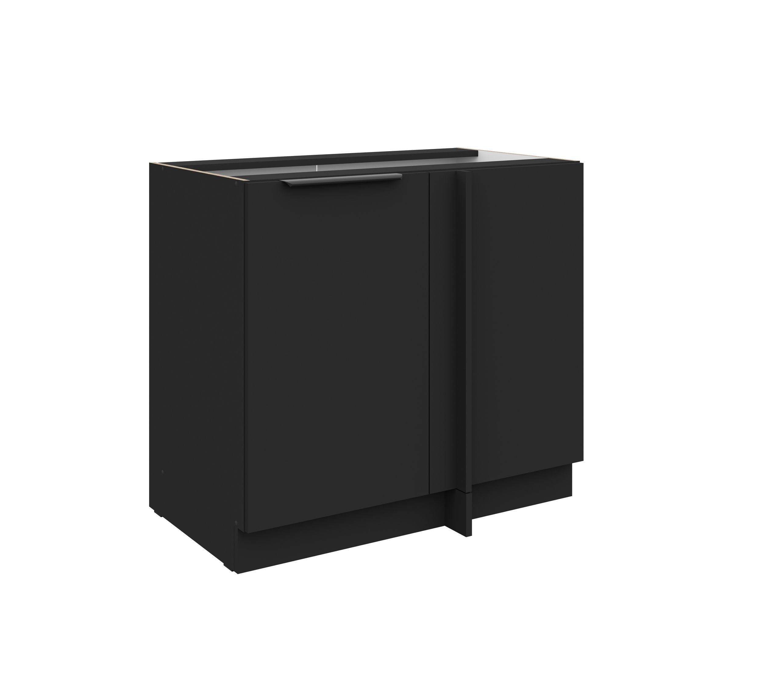 Eckunterschrank 90 cm für ein Stellmaß von 105x60 cm, mit einer Tür, und einem Einlegboden, ohne Arbeitsplatte.