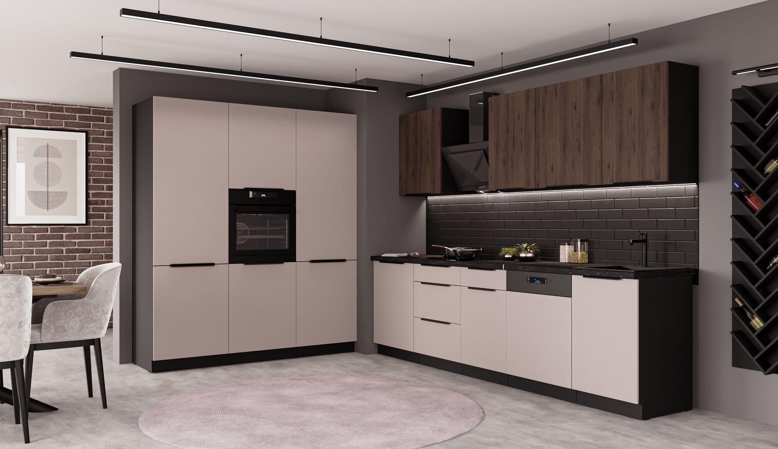Die vielseitige Küche ARONA + MONZA im modernen Mix aus den neuen Trendfarben Kaschmir beige matt + Okapi Nußbaum und schwarz matt, ist ein wahres Kombinations- und Stauraumwunder, in dem alle ihre Küchenutensilien Platz finden. Das edle Design und die gute Verarbeitung tun ein Übriges, um aus ihrer Küche eine Wohlfühloase zu machen. Все Türscharniere und Schubladen sind mit hochwertigen Dämpfern, für leises Спрятать der Fronten ausgestattet.