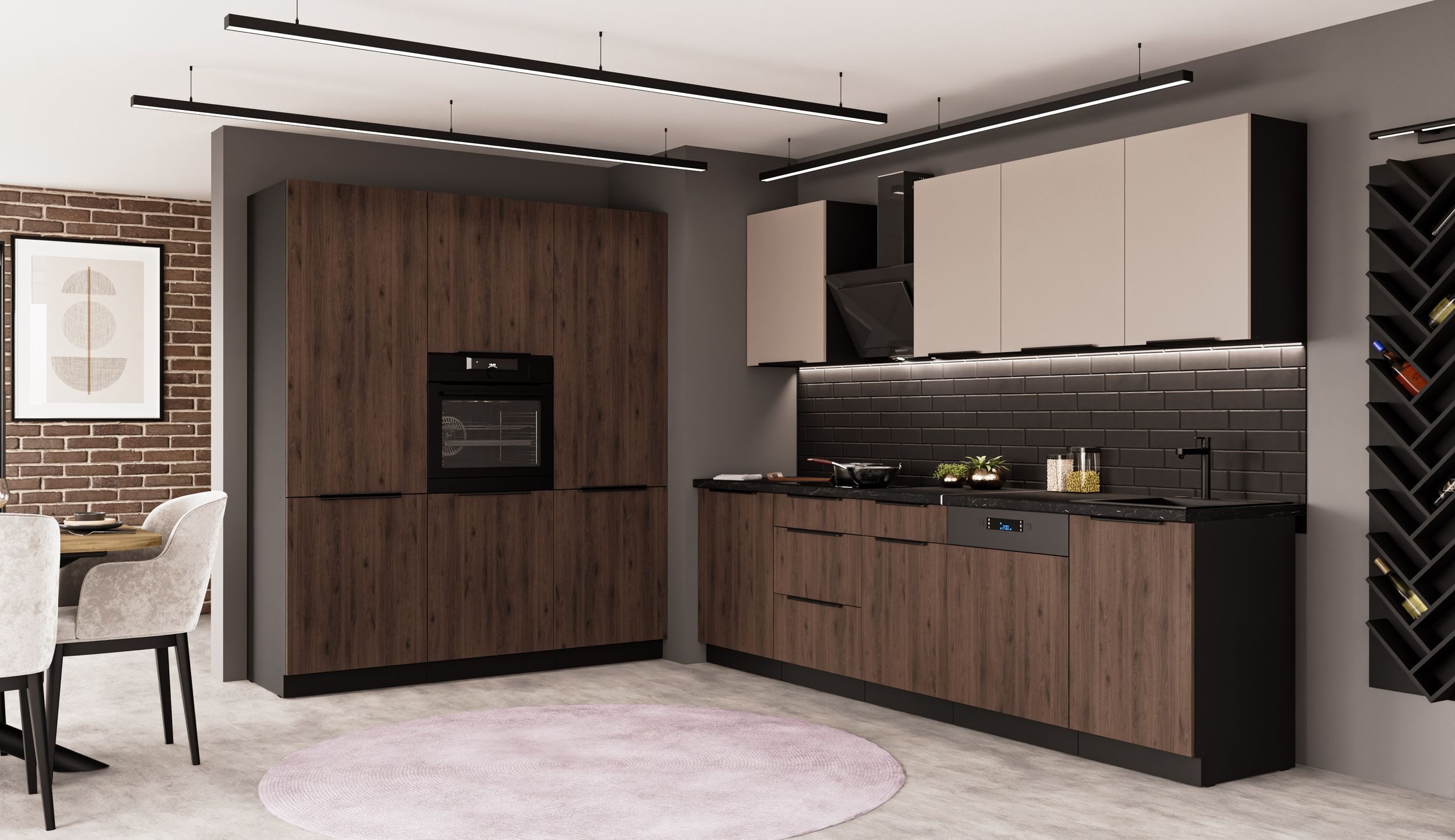 Die vielseitige Küche MONZA + ARONA im modernen Mix aus den neuen Trendfarben Kaschmir beige matt + Okapi Nußbaum und schwarz matt, ist ein wahres Kombinations- und Stauraumwunder, in dem alle ihre Küchenutensilien Platz finden. Das edle Design und die gute Verarbeitung tun ein Übriges, um aus ihrer Küche eine Wohlfühloase zu machen. Все Türscharniere und Schubladen sind mit hochwertigen Dämpfern, für leises Спрятать der Fronten ausgestattet.