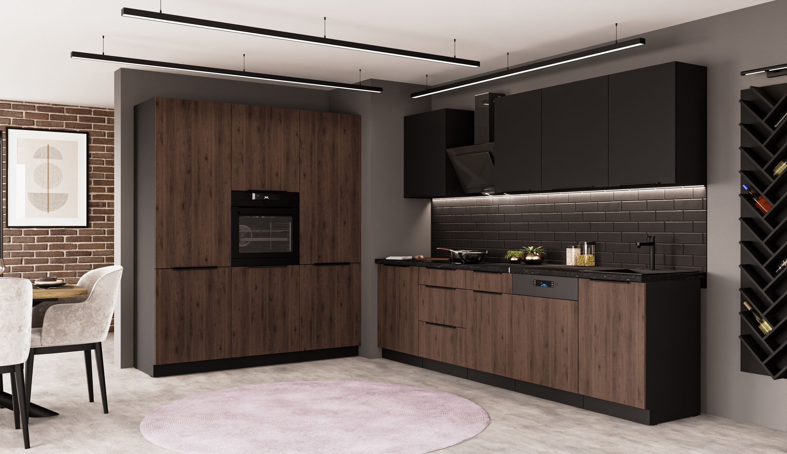 Die vielseitige Küche MONZA + SIENA im modernen Mix aus Okapi Nussbaum und schwarz matt Design ist ein wahres Kombinations- und Stauraumwunder, in dem alle ihre Küchenutensilien Platz finden. Das edle Design und die gute Verarbeitung tun ein Übriges, um aus ihrer Küche eine Wohlfühloase zu machen. Все Türscharniere und Schubladen sind mit hochwertigen Dämpfern, für leises Спрятать der Fronten ausgestattet.