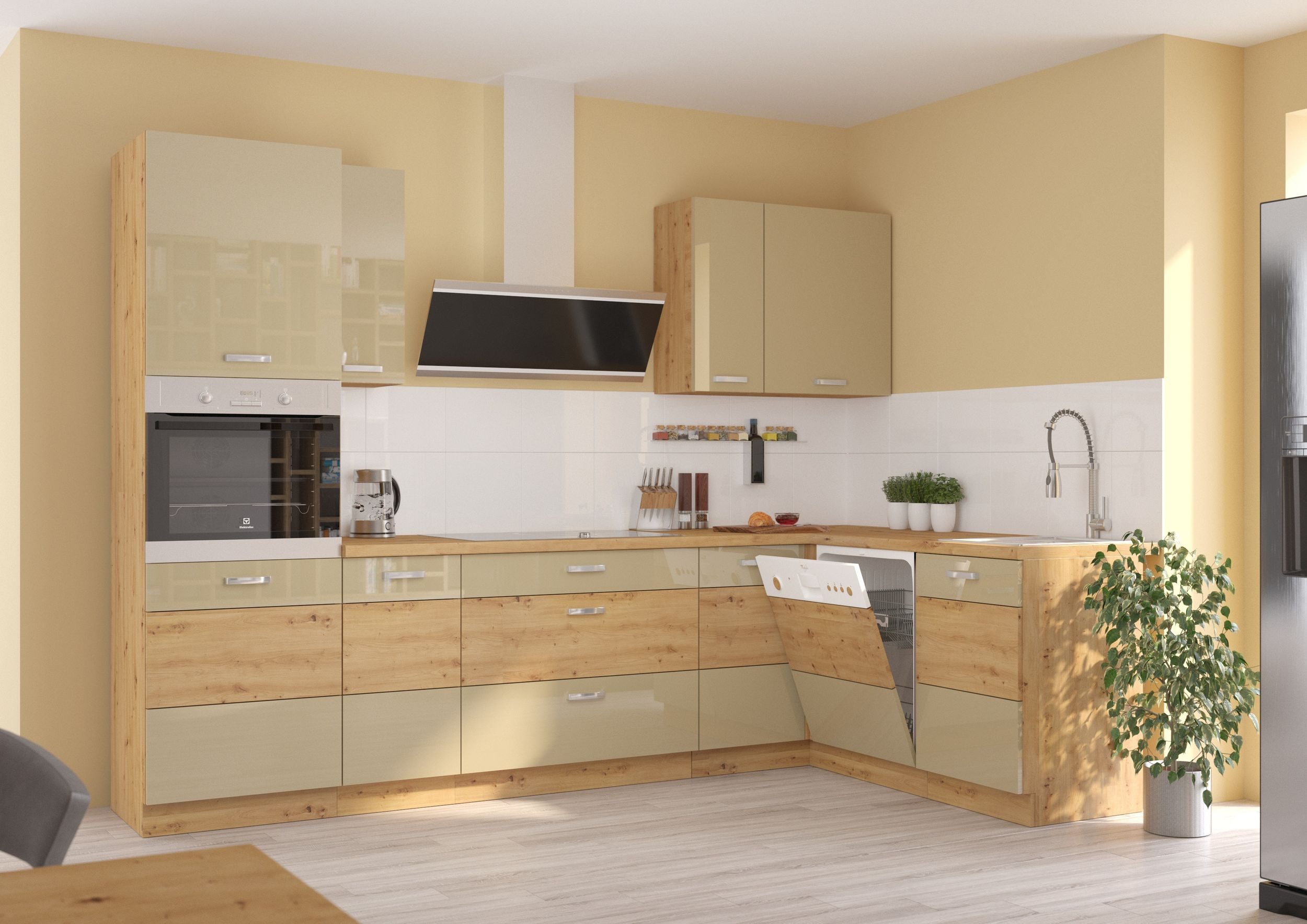 Diese praktische Winkelküche im modernen Hochglanz Cappuccino + Eiche Artisan Design ist ein wahres Kombinations-/ und Stauraumwunder, in dem alle Ihre Küchenutensilien Platz finden. Das edle Design und die gute Verarbeitung tun ein Übriges, um aus Ihrer Küche eine Wohlfühloase zu machen.