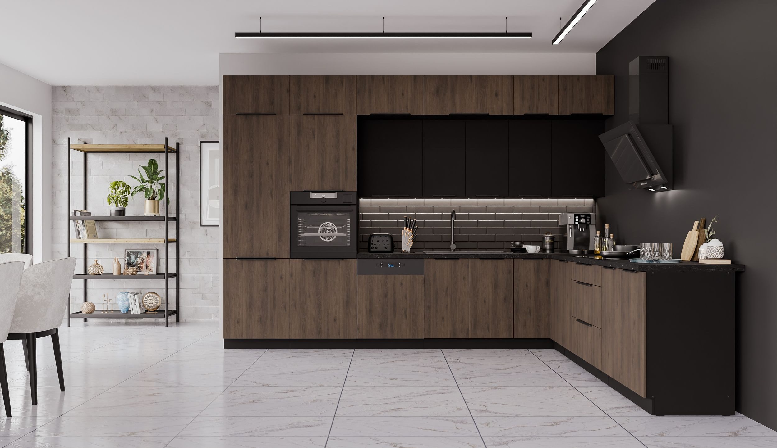 Die vielseitige Küche MONZA + SIENA im modernen Mix aus Okapi Nussbaum und schwarz matt Design ist ein wahres Kombinations- und Stauraumwunder, in dem alle ihre Küchenutensilien Platz finden. Das edle Design und die gute Verarbeitung tun ein Übriges, um aus ihrer Küche eine Wohlfühloase zu machen. Все Türscharniere und Schubladen sind mit hochwertigen Dämpfern, für leises Спрятать der Fronten ausgestattet. Ergänzend kommen hier noch 6x Aufsatzschränke (NAGU) hinzu, um noch mehr Stauraum zu erhalten.