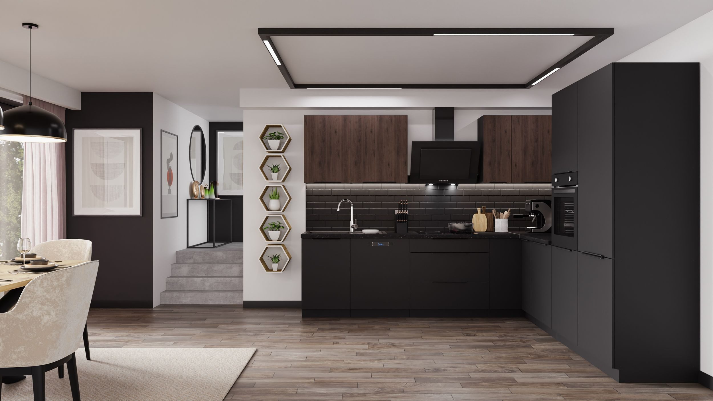 Die vielseitige Küche SIENA + MONZA im modernen Mix aus Okapi Nussbaum und schwarz matt Design ist ein wahres Kombinations- und Stauraumwunder, in dem alle ihre Küchenutensilien Platz finden. Das edle Design und die gute Verarbeitung tun ein Übriges, um aus ihrer Küche eine Wohlfühloase zu machen. Все Türscharniere und Schubladen sind mit hochwertigen Dämpfern, für leises Спрятать der Fronten ausgestattet.