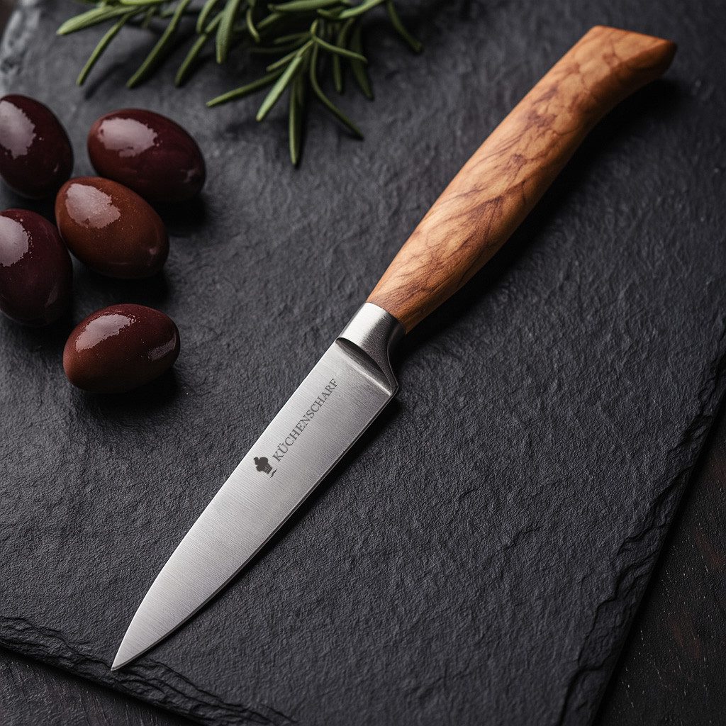Das Premium Universalmesser (9,12 & 15 cm) wird zu 100 % in Deutschland gefertigt – CNC-geschliffen, von Hand blaupließtet und eisgehärtet für maximale Schärfe, Schnitthaltigkeit und Korrosionsschutz. Die Klinge aus hochwertigem Edelstahl erfüllt höchste Ansprüche in der Küche. Der ergonomische Griff aus antibakteriellem Olivenholz liegt perfekt in der Hand, ist wasserabweisend, extrem robust und macht jedes Messer zum Unikat.