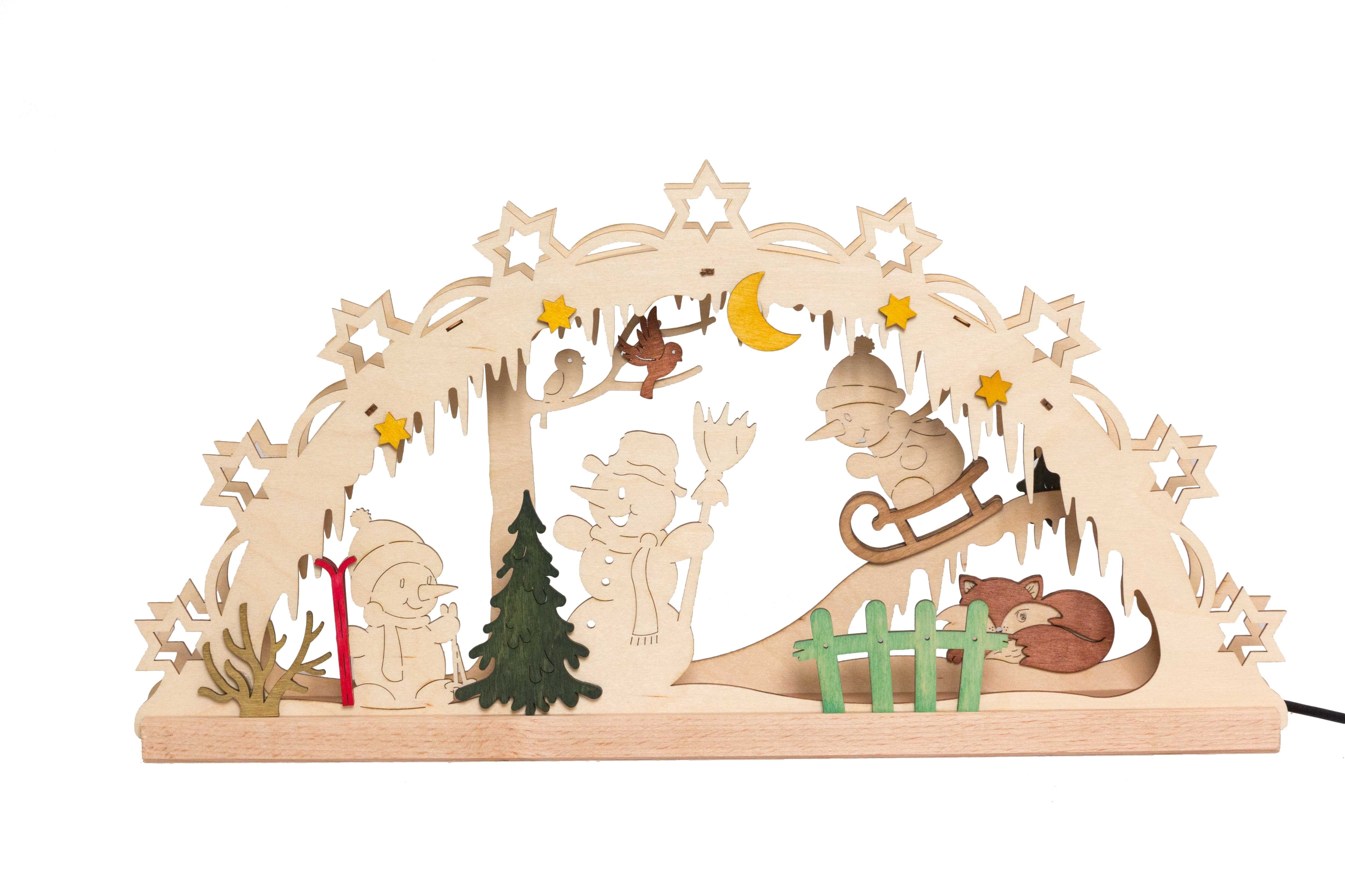 Eine wunderschöne Winterdekoration nach erzgebirgischer Tradition: Der Schwibbogen als Bastelset zum Selbstbauen. Selbstgebasteltes erfreut doch immer wieder die Herzen der Beschenkten am Meisten. Hier sind unsere Bastelsets eine wertvolle Hilfe. Mit den passgenau gefertigten Einzelteilen aus Holz können auch kleine, angehende Holzhandwerker bewundernswerte Geschenke selbst fertigen. Die meisten fertig gebastelten Sets lassen sich mit Wasserfarben, Acrylfarben, Filz- oder Wachsmalstiften noch weiter verschönern. Leim und Farbstifte sind nicht im Lieferumfang enthalten. Bei den Bastelsets handelt es sich nicht um Spielzeug.