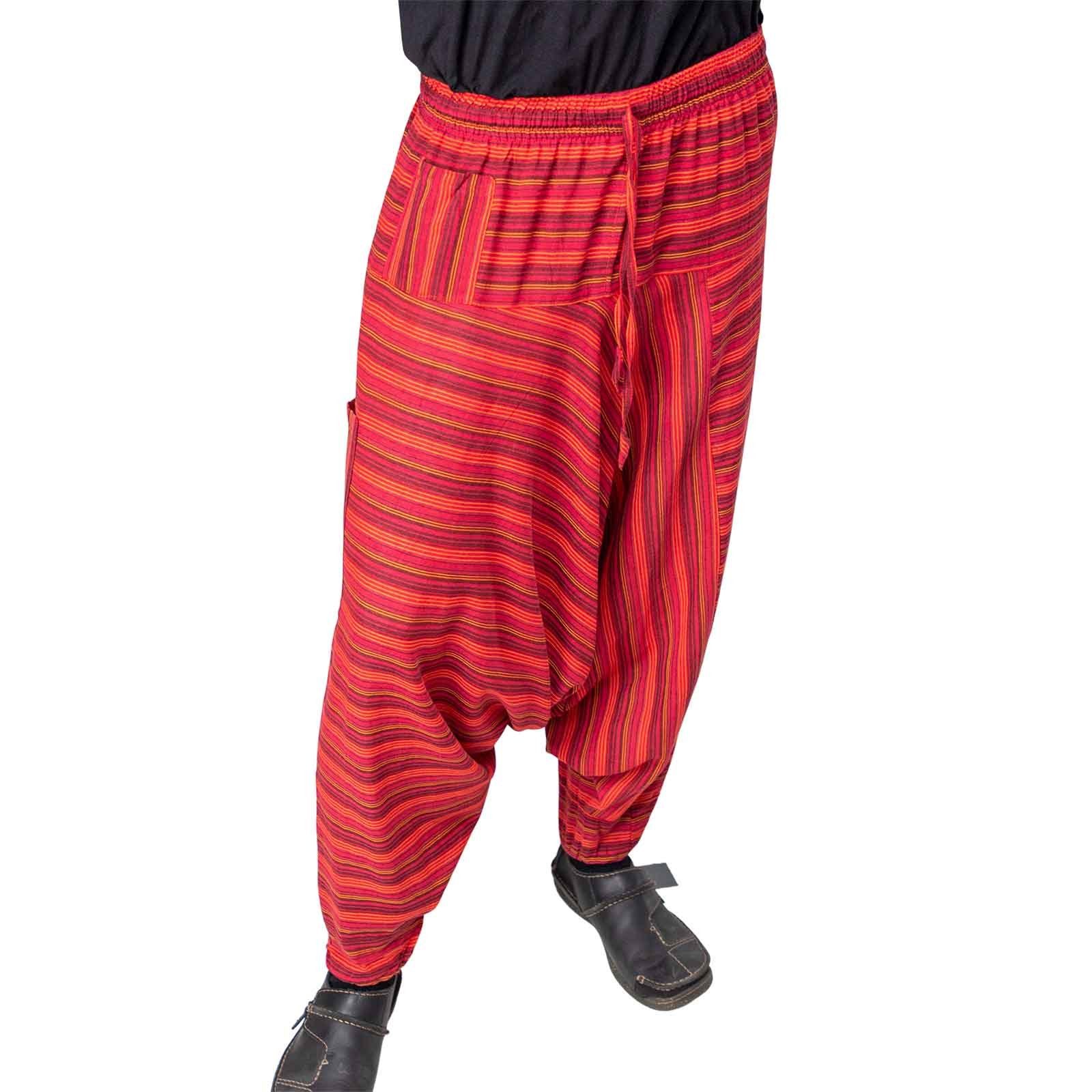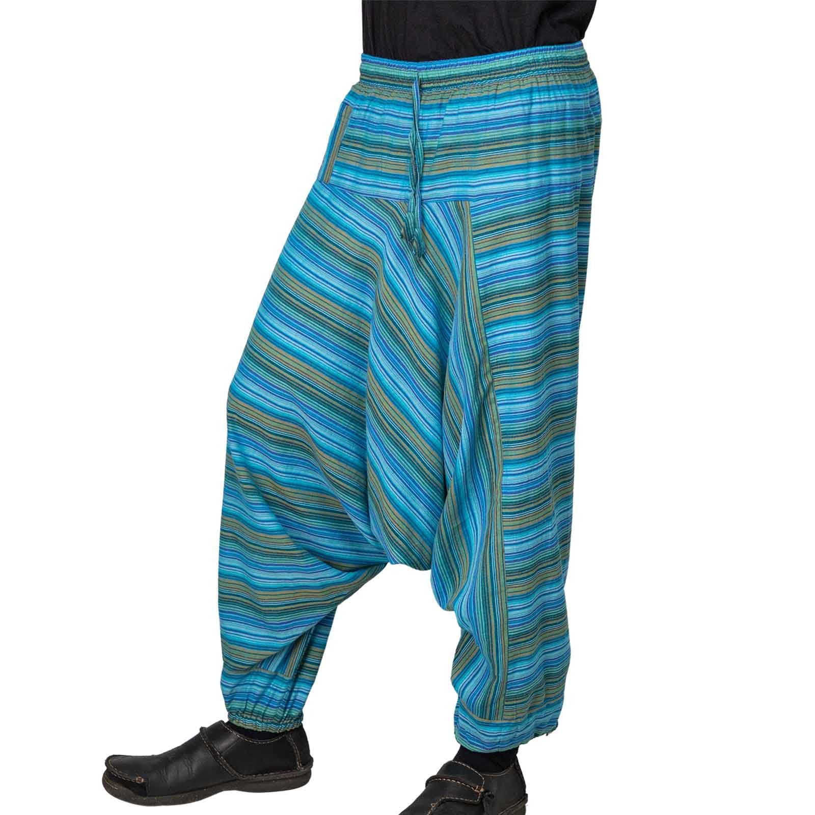Mit elastischen Gummizügen an Bund und Beinen, dadurch passt sich diese Goa-Hose der Körpergröße an.Sowohl auf Taille, als auch auf Hüfte bequem tragbar.Die elastischen Gummizüge an den Hosenbeinen können auch auf Kniehöhe getragen werden und verwandeln so die Haremshose in einen bequemen Hosenrock.