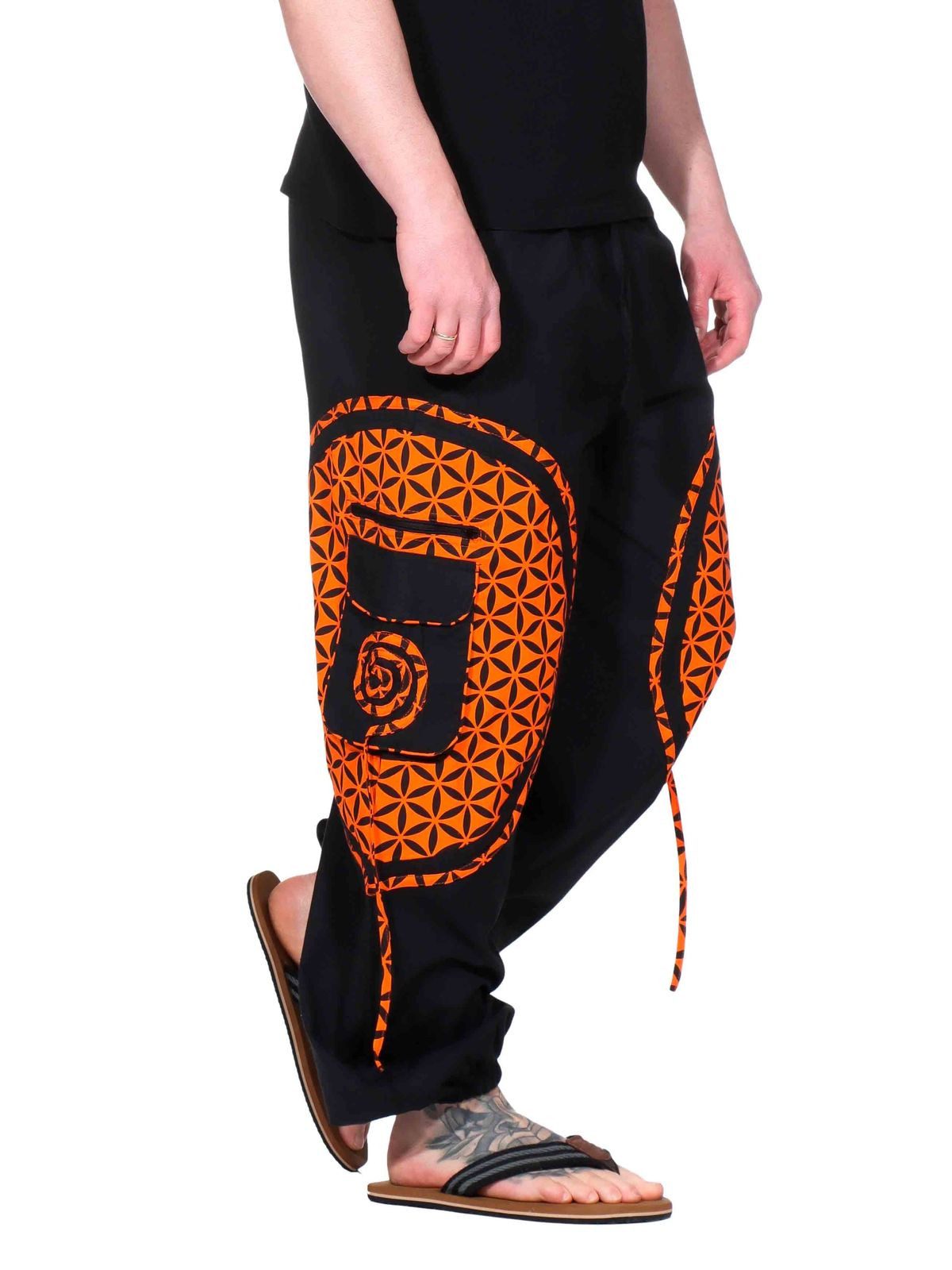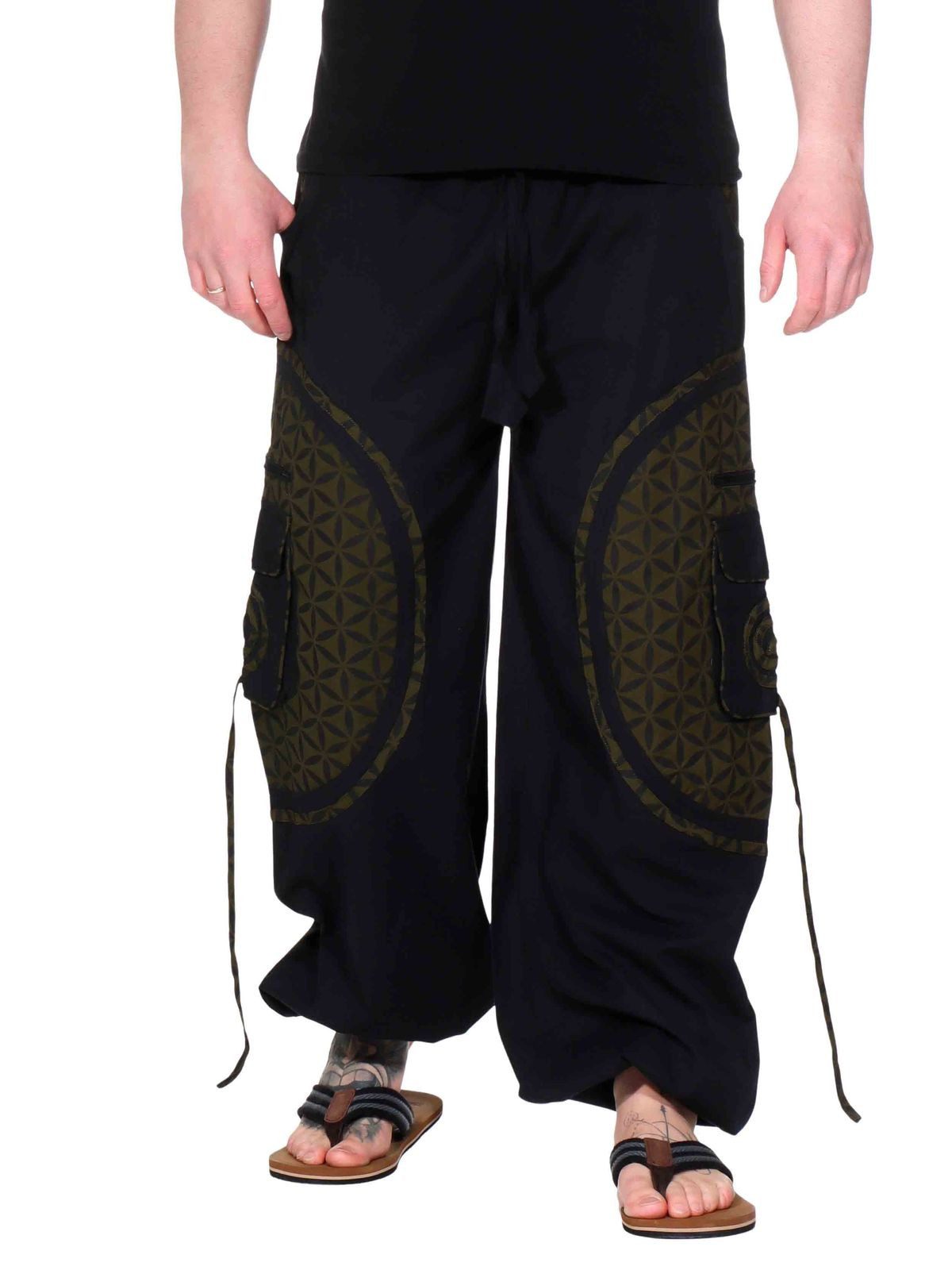 Die Gummizüge unten an den Hosenbeinen können auch auf Kniehöhe getragen werden und verwandeln so die Haremshose in eine bequeme kurze Hose