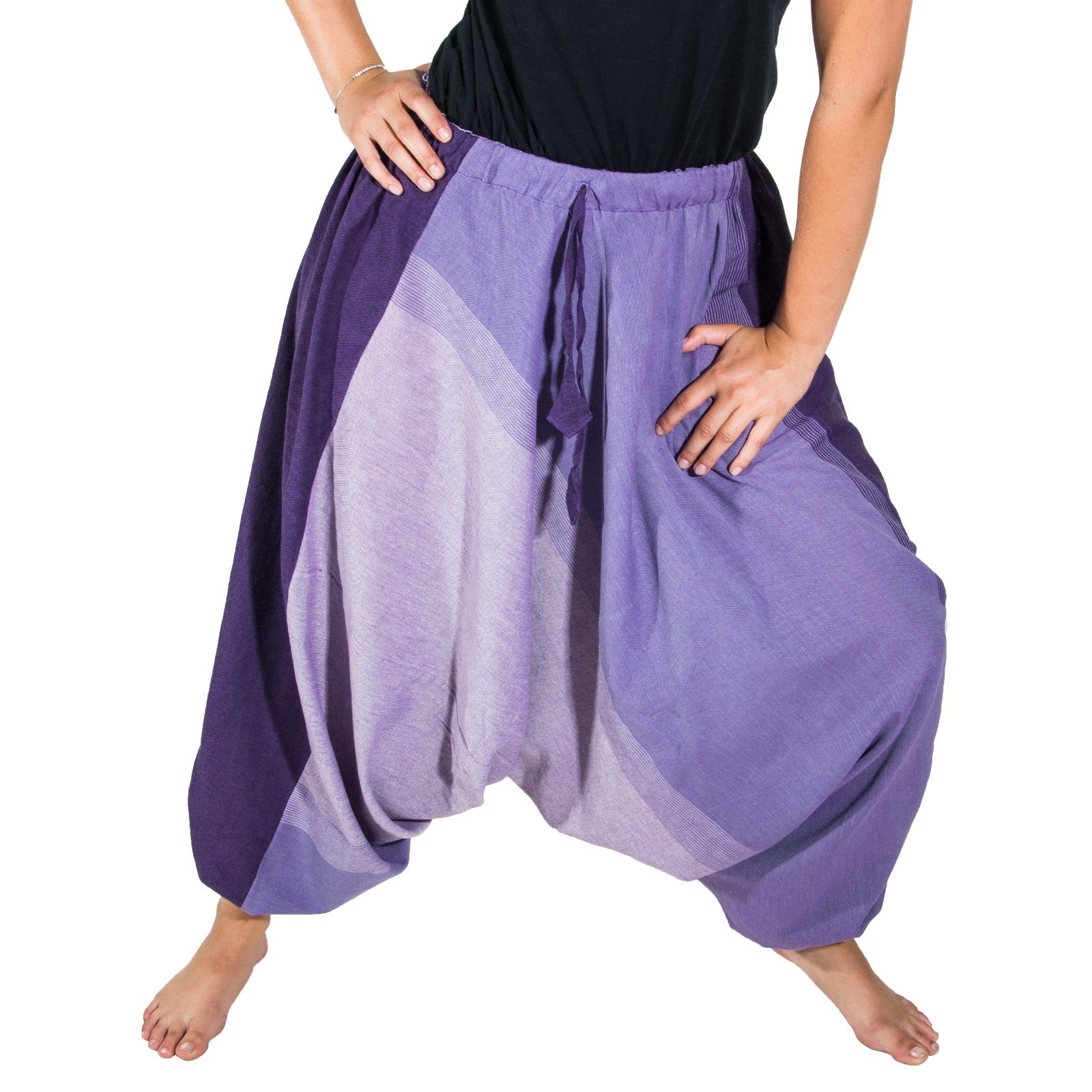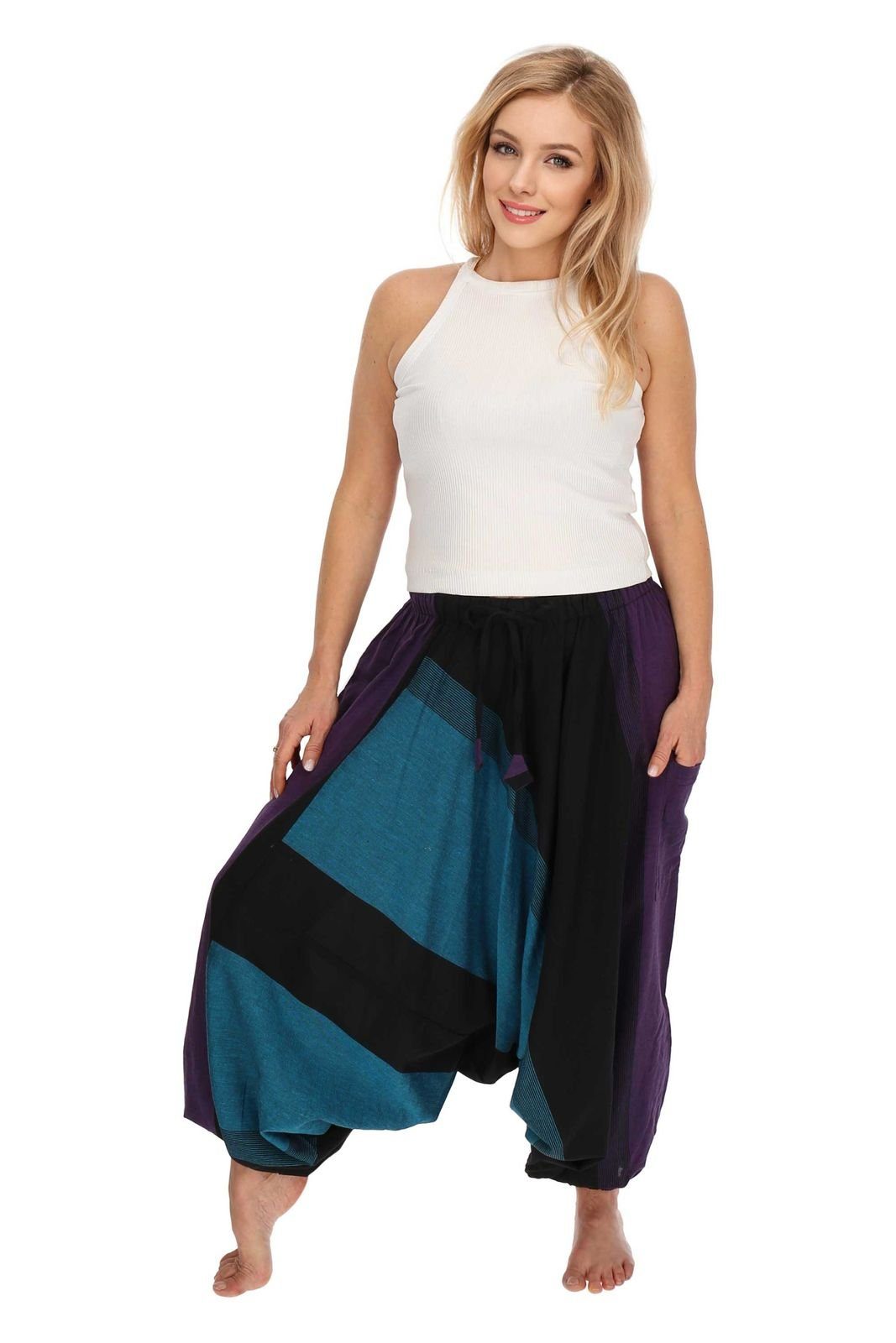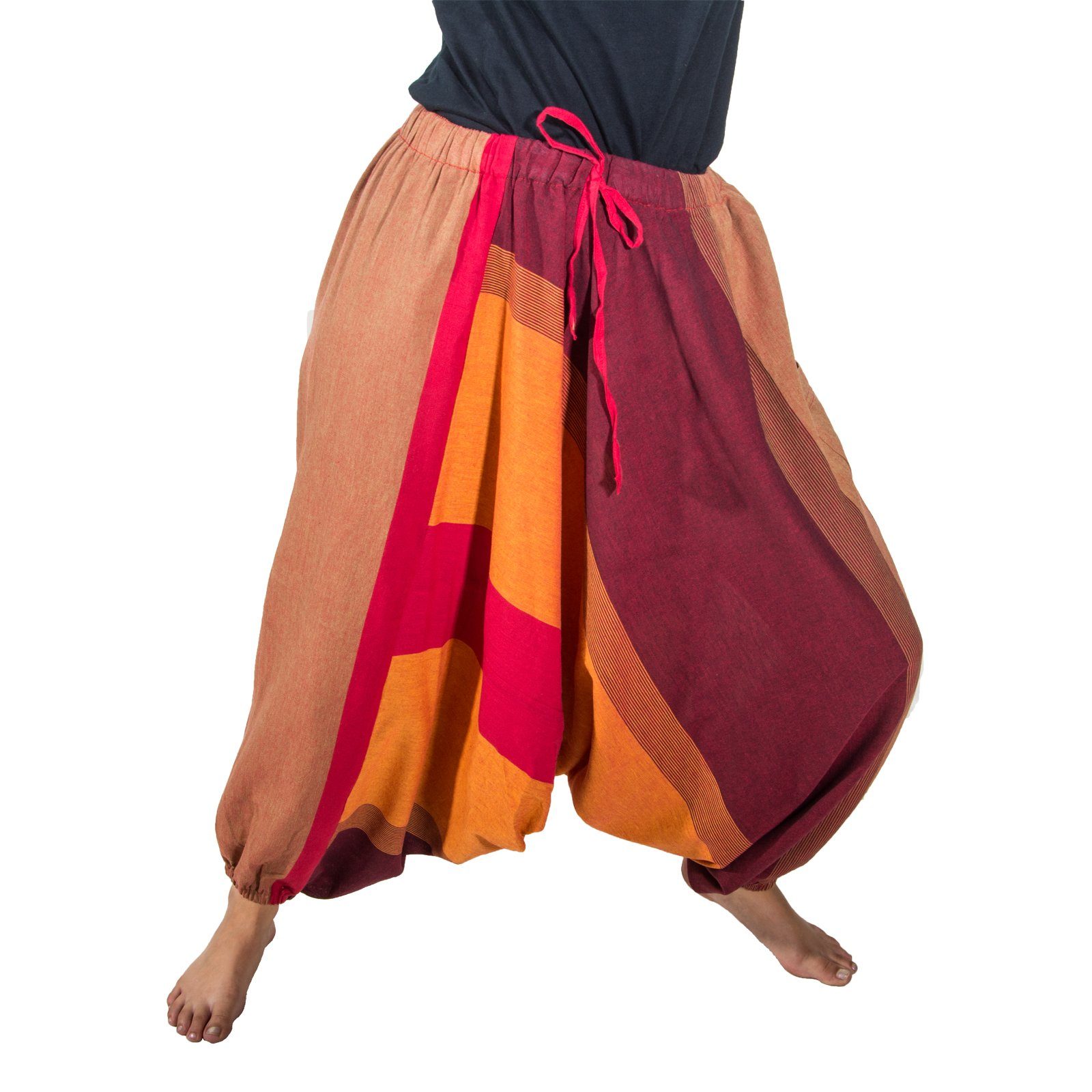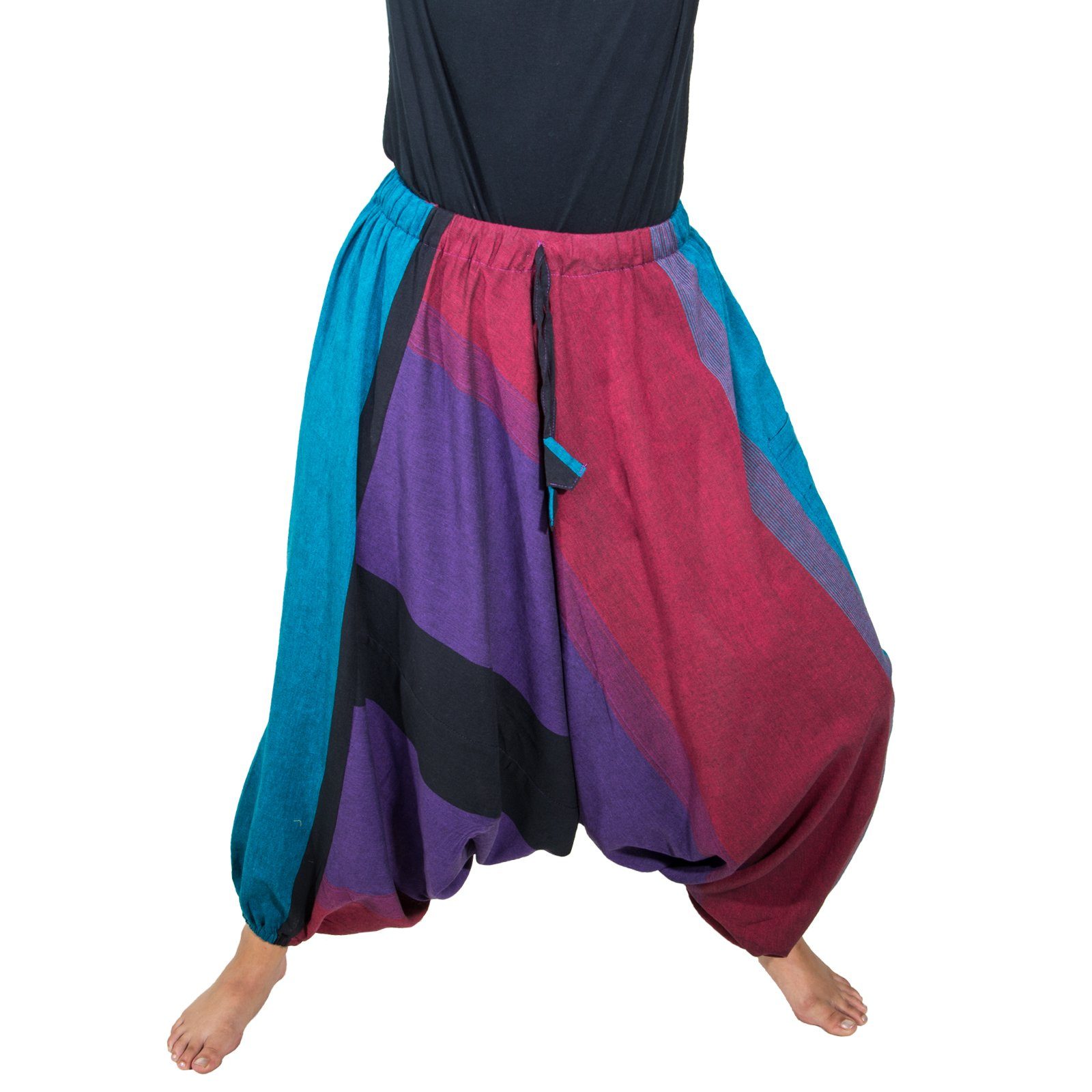 Die Gummizüge unten an den Hosenbeinen können auch auf Kniehöhe getragen werden und verwandeln so die Haremshose in einen bequemen Hosenrock.