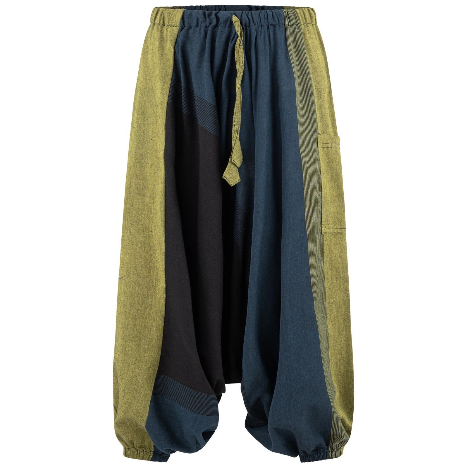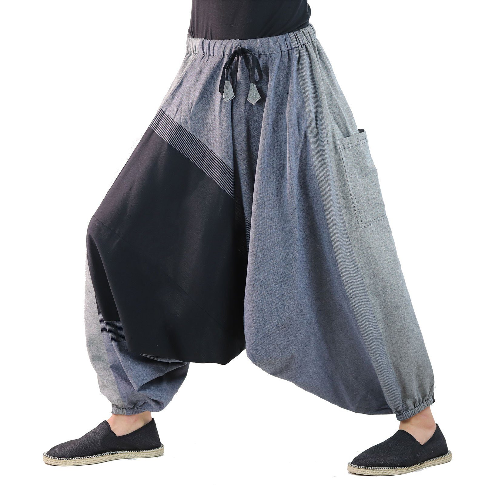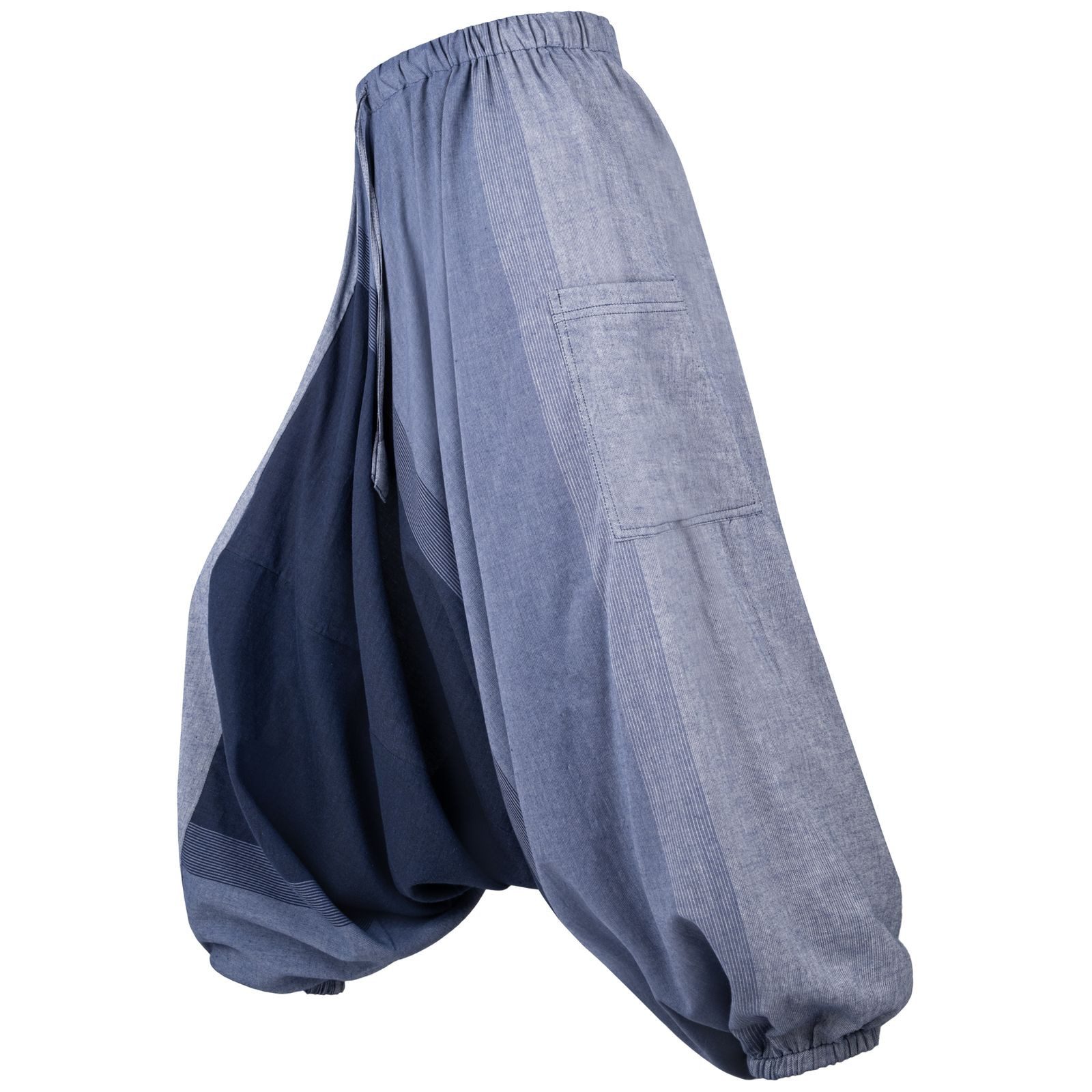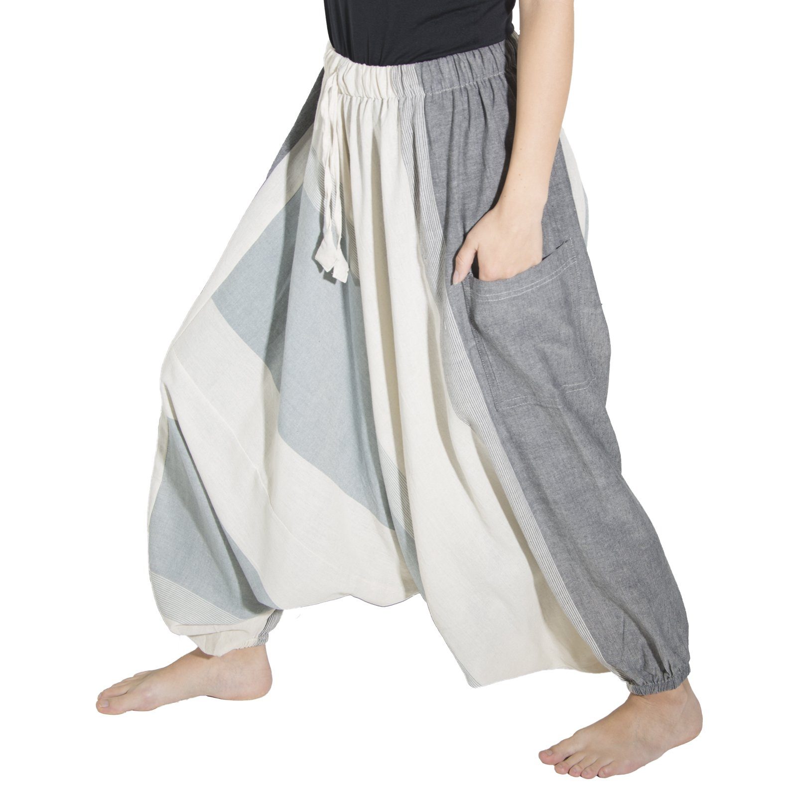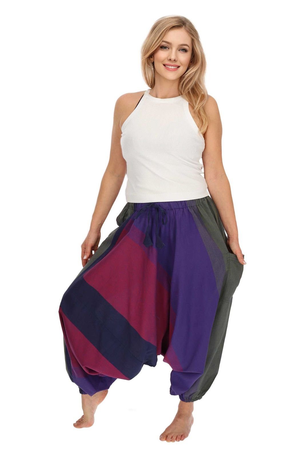 Die Gummizüge unten an den Hosenbeinen können auch auf Kniehöhe getragen werden und verwandeln so die Haremshose in einen bequemen Hosenrock.
