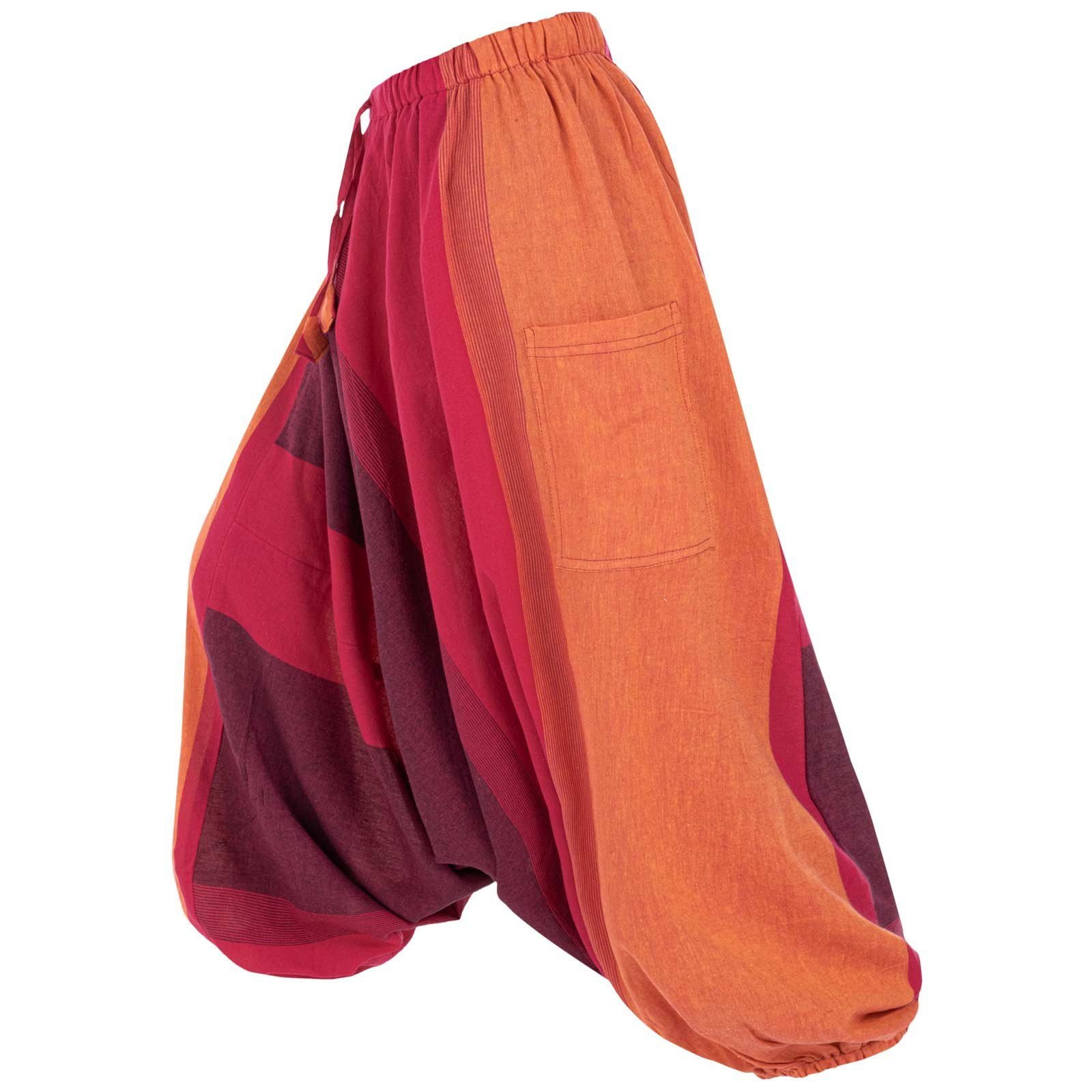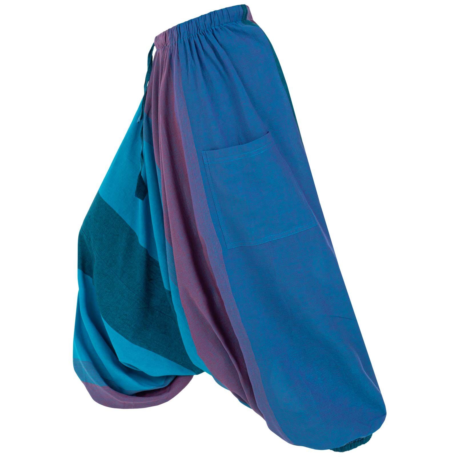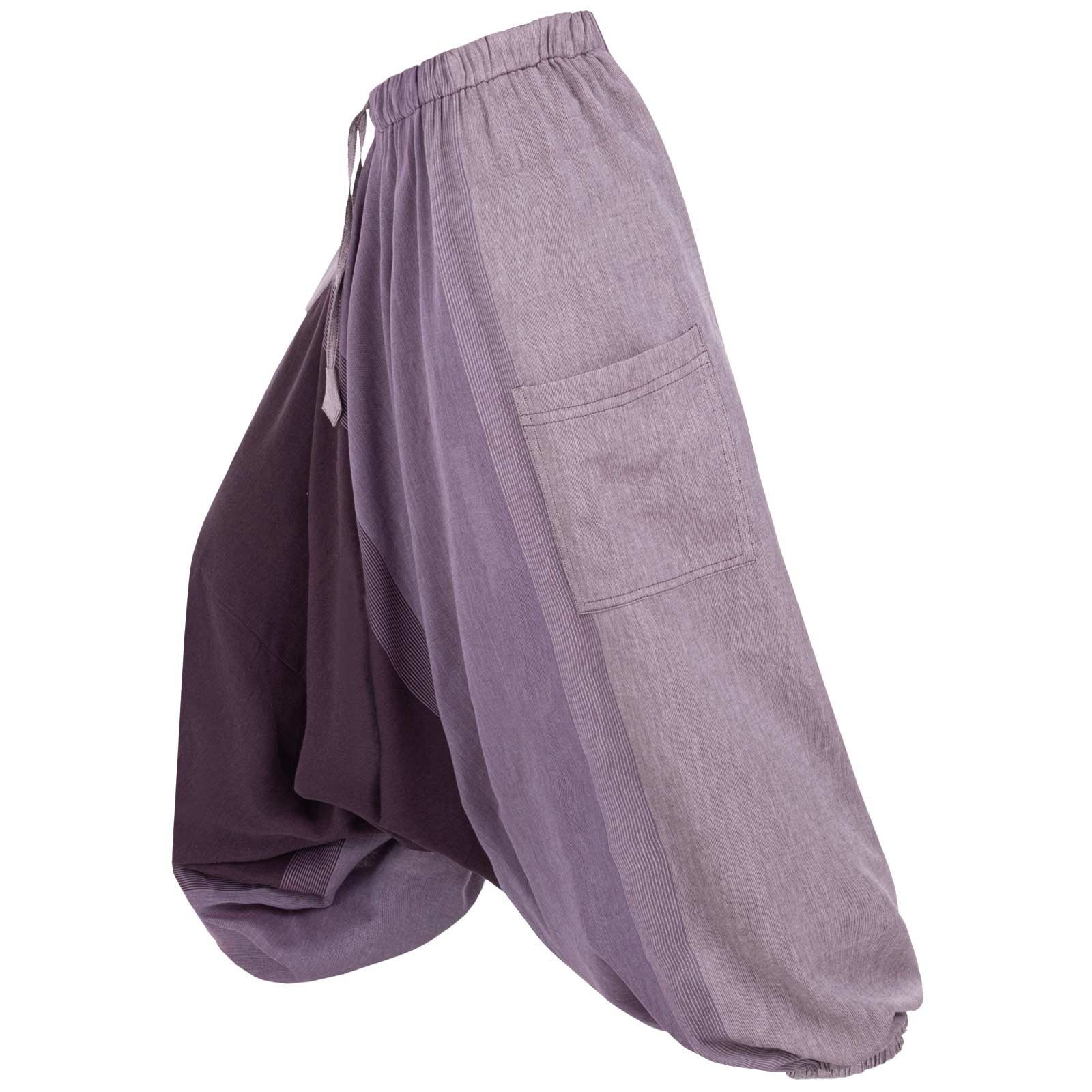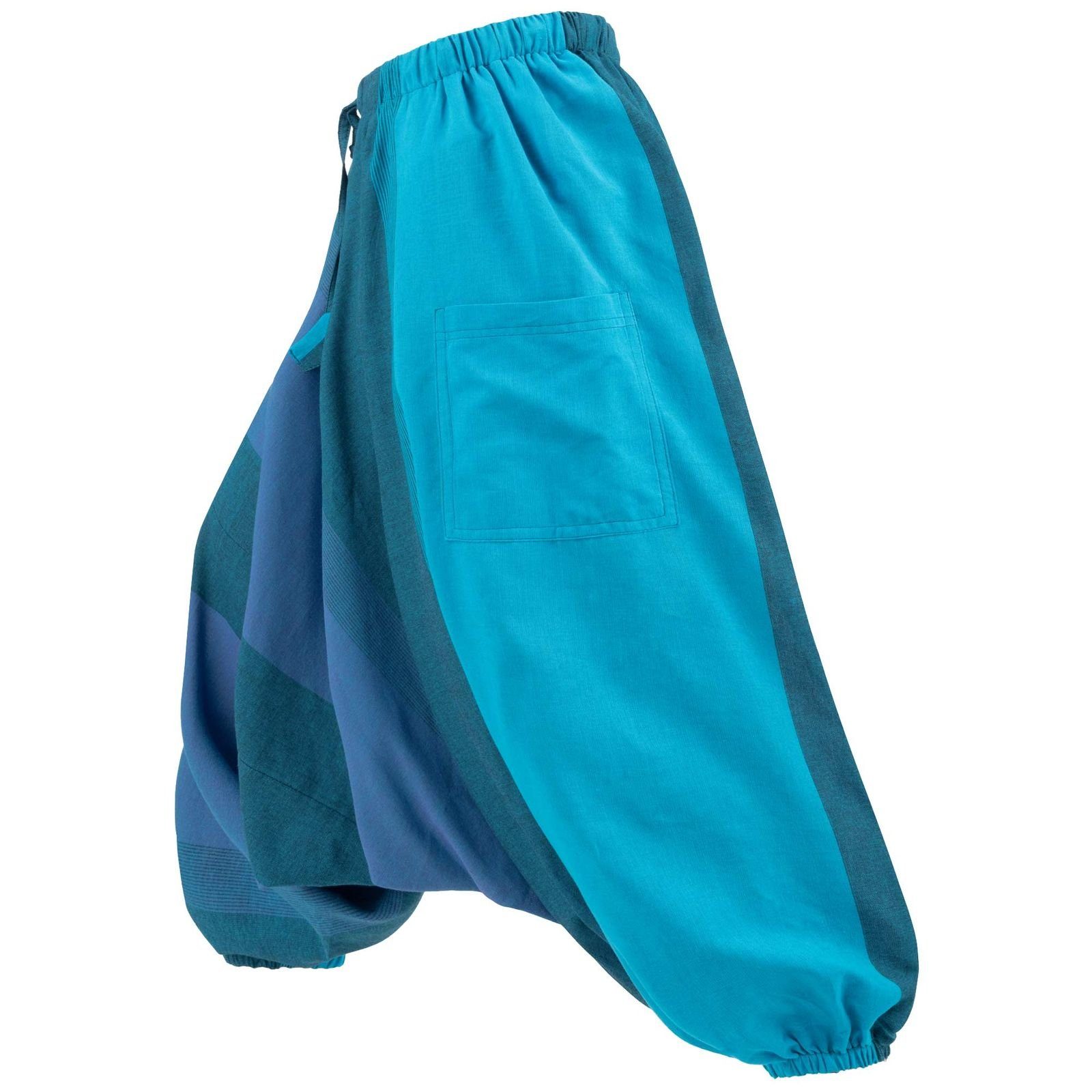 Die Gummizüge unten an den Hosenbeinen können auch auf Kniehöhe getragen werden und verwandeln so die Haremshose in einen bequemen Hosenrock.