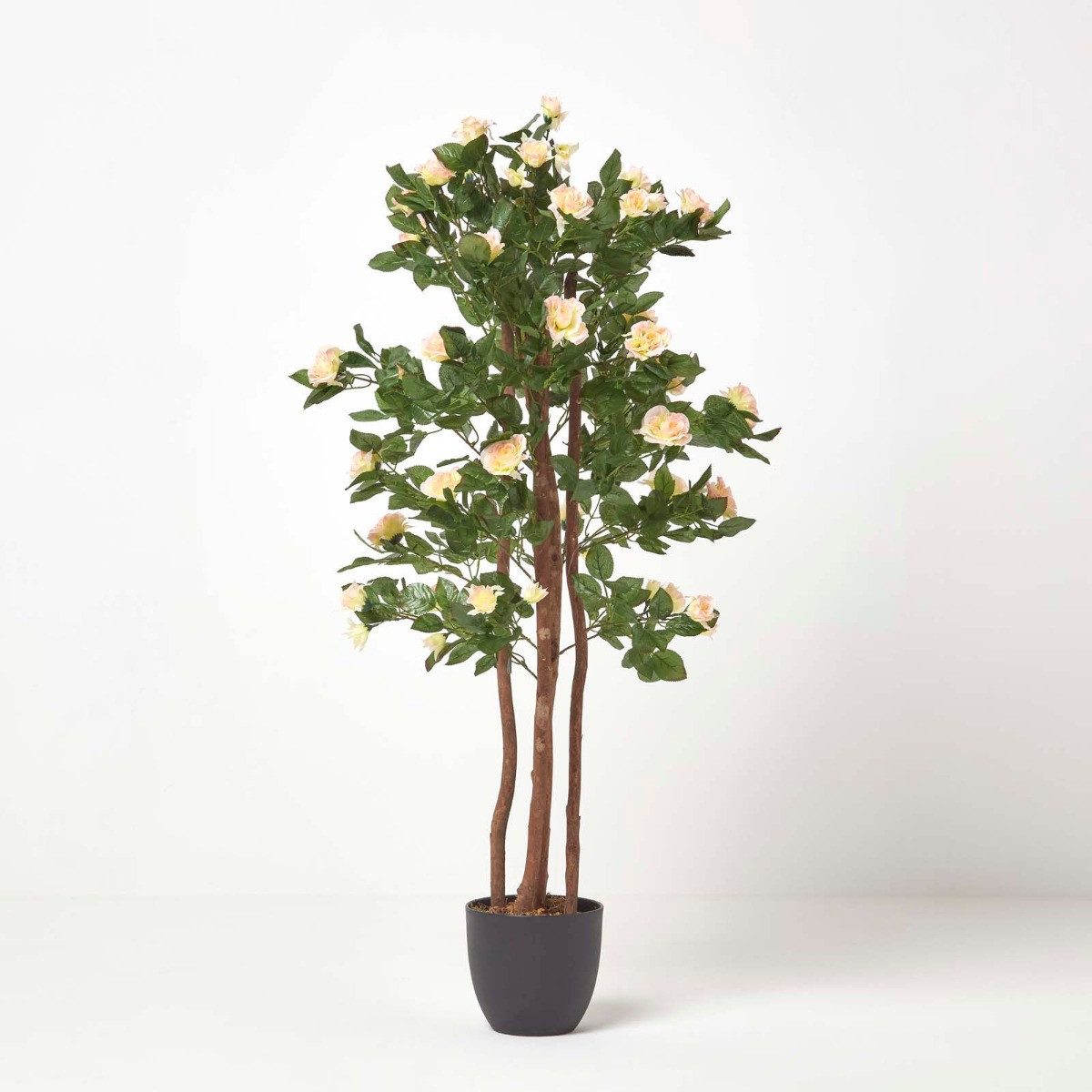Bezauberndes, etwa 122 cm großes künstliches Rosenbäumchen mit Blüten in zartem Rosa und lebhaft grünen Blättern in einem schwarzen Topf.