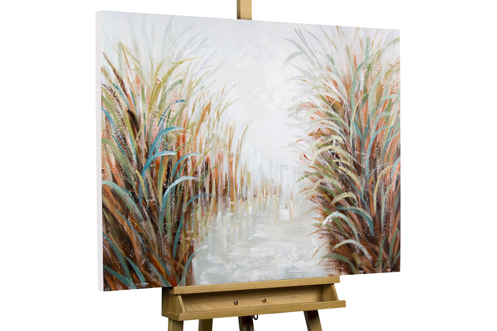 Das handgemalte Acrylbild 'Ader der Natur' verbreitet seine beruhigende Wirkung vom ersten Moment an. Die braungrünen Schilfrohre wiegen ruhig vor sich her und der helle See ruht still unter weißem Himmel. Die Komposition wirkt sehr ruhig, sodass das mystischen Gemälde Ihre Küche verschönert und Sie täglich Ihre Stilsicherheit beweisen.