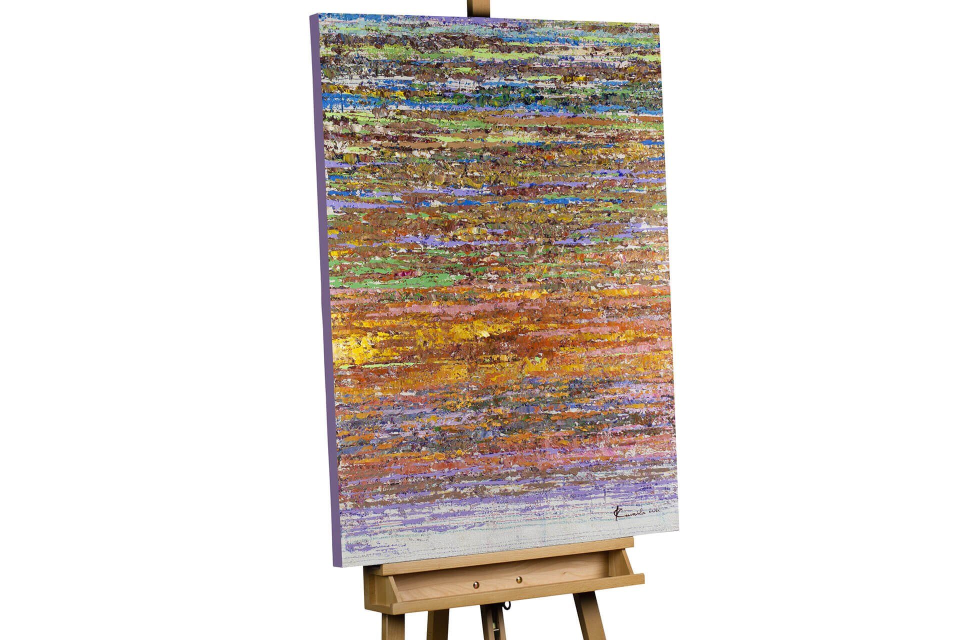 'Nie den Faden verlieren' schmückt die Wand Ihres Wohnzimmers mit seinem eigenen Charme. Die horizontalen bunten Farbflächen gestalten das Bild lebhaft. Die Detailverliebtheit des abstrakten Gemäldes bleibt auch Ihren Gästen nicht verborgen. Dekorieren Sie Ihr Zuhause mit diesem Kunstwerk und lassen Sie sich von seiner positiven Aura anstecken.
