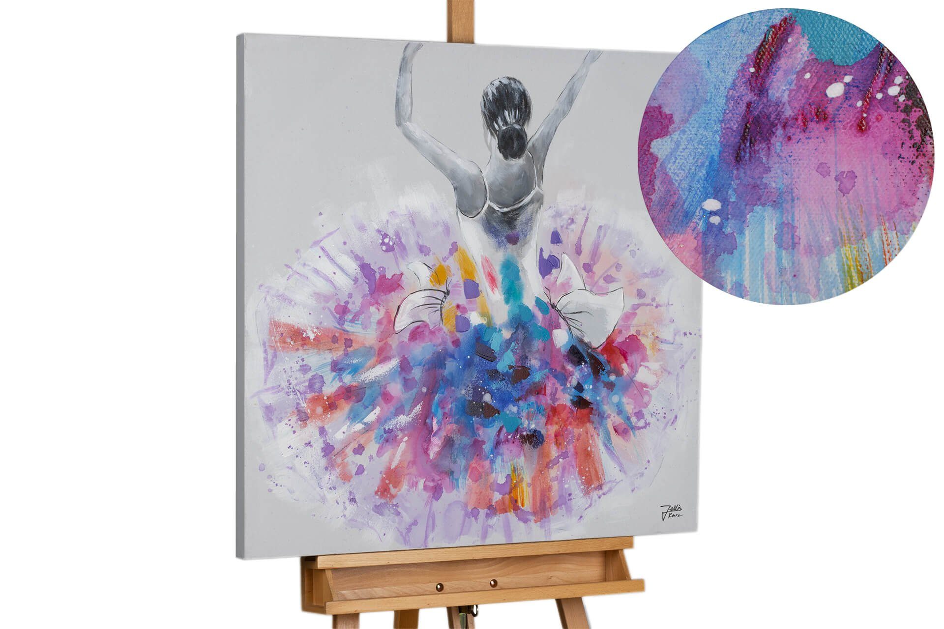 In 'Primaballerina' ist die Szene einer tanzenden Frau eingefangen. Das Tutu der Ballerina schwingt in lila, grauen und blauen Farbtupfern und wirkt, als würde es sich in der Drehbewegung auflösen. Bezaubern Sie Ihre Besucher jedes Mal aufs Neue mit diesem handgemalten Leinwandgemälde in Ihrem Schlafzimmer oder Kinderzimmer.