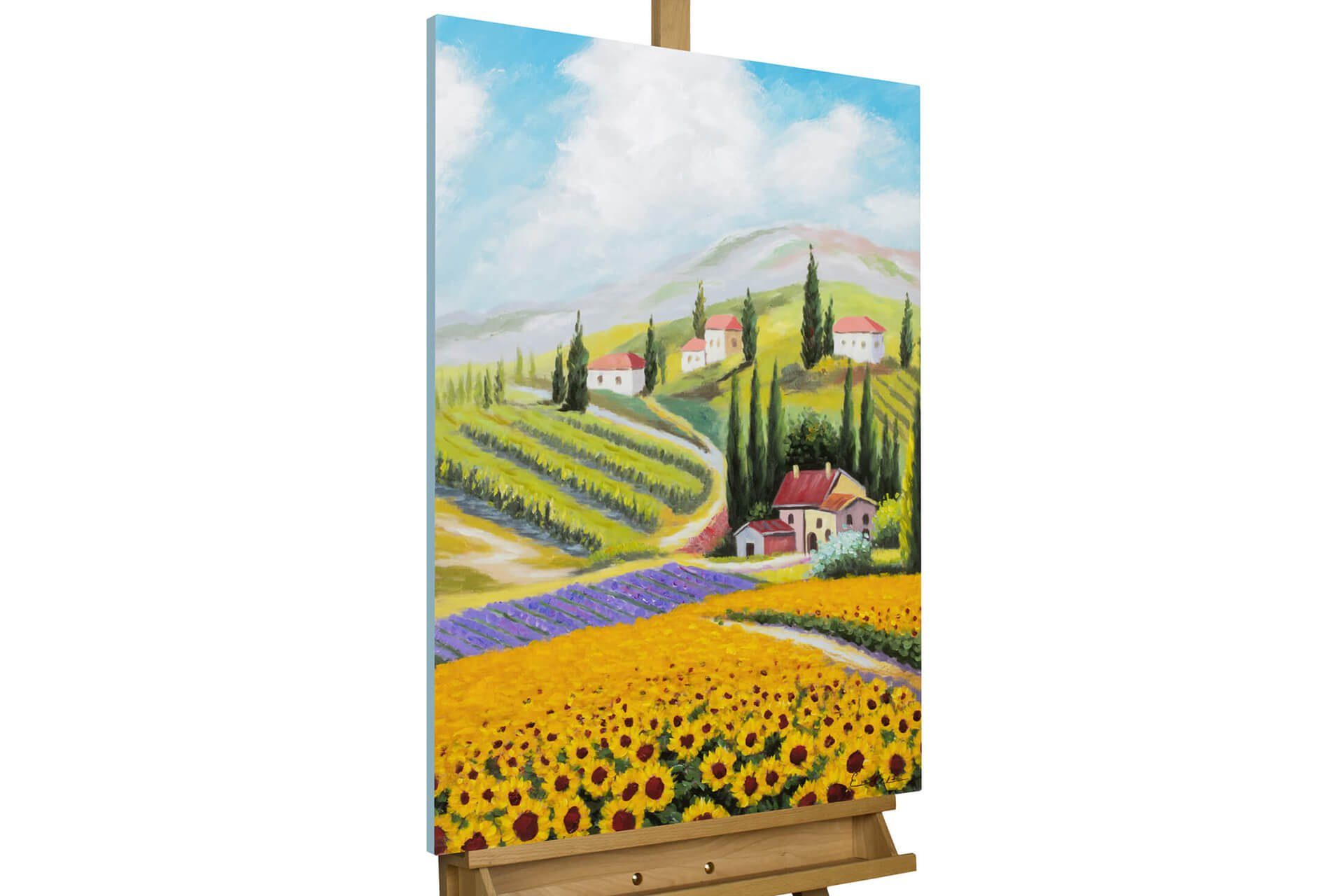 Unter einem strahlenden Himmel, zwischen großen Zypressen und Landhäuser, erinnert das handgemalte Acrylgemälde an die italienische Region Toskana. Duftende Lavendelfelder und prächtige Sonnenblumen ergänzen das Leinwandgemälde harmonisch. Das Kunstwerk mit seinen bunten Farben weckt in Ihrem Wohnzimmer in eine 'Sommerliche Nostalgie'.
