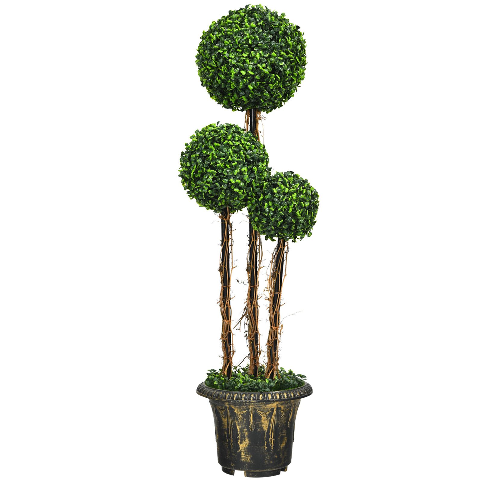 Mit den leuchtend grünen Blättern und dem Echtholz-Rattan wirkt der 120 cm große Kunstbaum mit drei Kugeln so realistisch. Man kann ihn nicht einmal von einem echten unterscheiden. Um das ganze Jahr über ein frisches und grünes Aussehen zu bieten, verfügt der künstliche Baum über hochwertige PE-Blätter. Dichte Blätter und lebendige Farben vermitteln einen Hauch von Natur, während das Echtholz-Rattan für ein lebendigeres Element sorgt. Es besteht kein Grund zur Sorge über das Qualitätsproblem. Seine PE-Blätter sind geruchlos und ungiftig in der Anwendung. Um die Haltbarkeit zu erhöhen, ist der Dekotopf mit Zement gefüllt, um eine allgemeine Stabilität zu gewährleisten und ein Verrutschen zu verhindern. Außerdem ist er eine perfekte Innen- und Außendekoration für Zuhause, Büro, Balkon, Garten und mehr. Da er UV- und wasserbeständig ist, können Sie ihn problemlos auch im Freien aufstellen. Dieser Kunstbaum passt genau zu Ihren Wünschen.