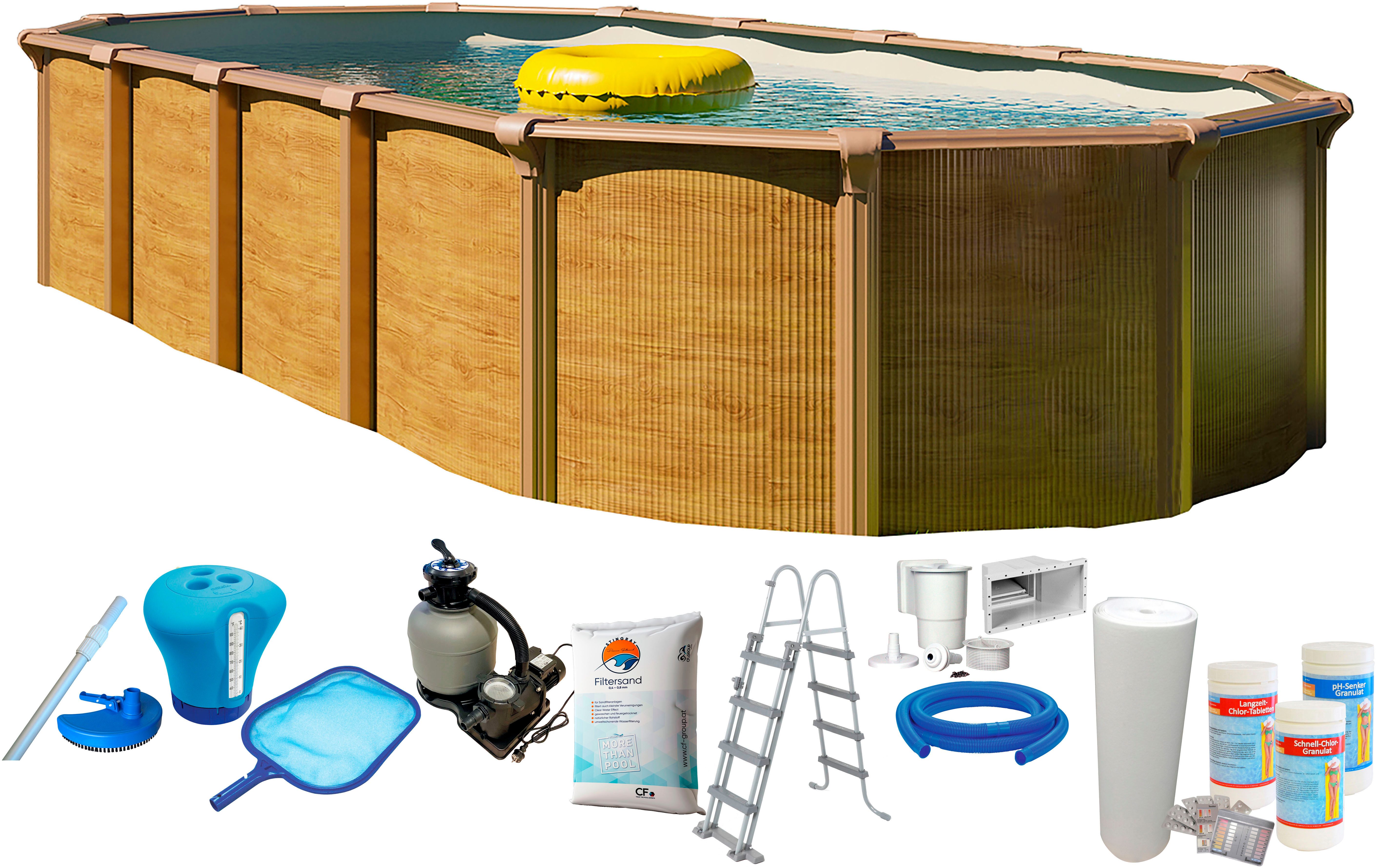 Lieferumfang | Bodensaugerbürste mit Teleskopstange Bodenschutzvlies Chlordosierer mit Thermometer (zufällige Farbauswahl) Kescher Leiter Quarzsand Sandfilteranlage Wasserpflege-Set Wasserpflegeset Wassertest-Kit |