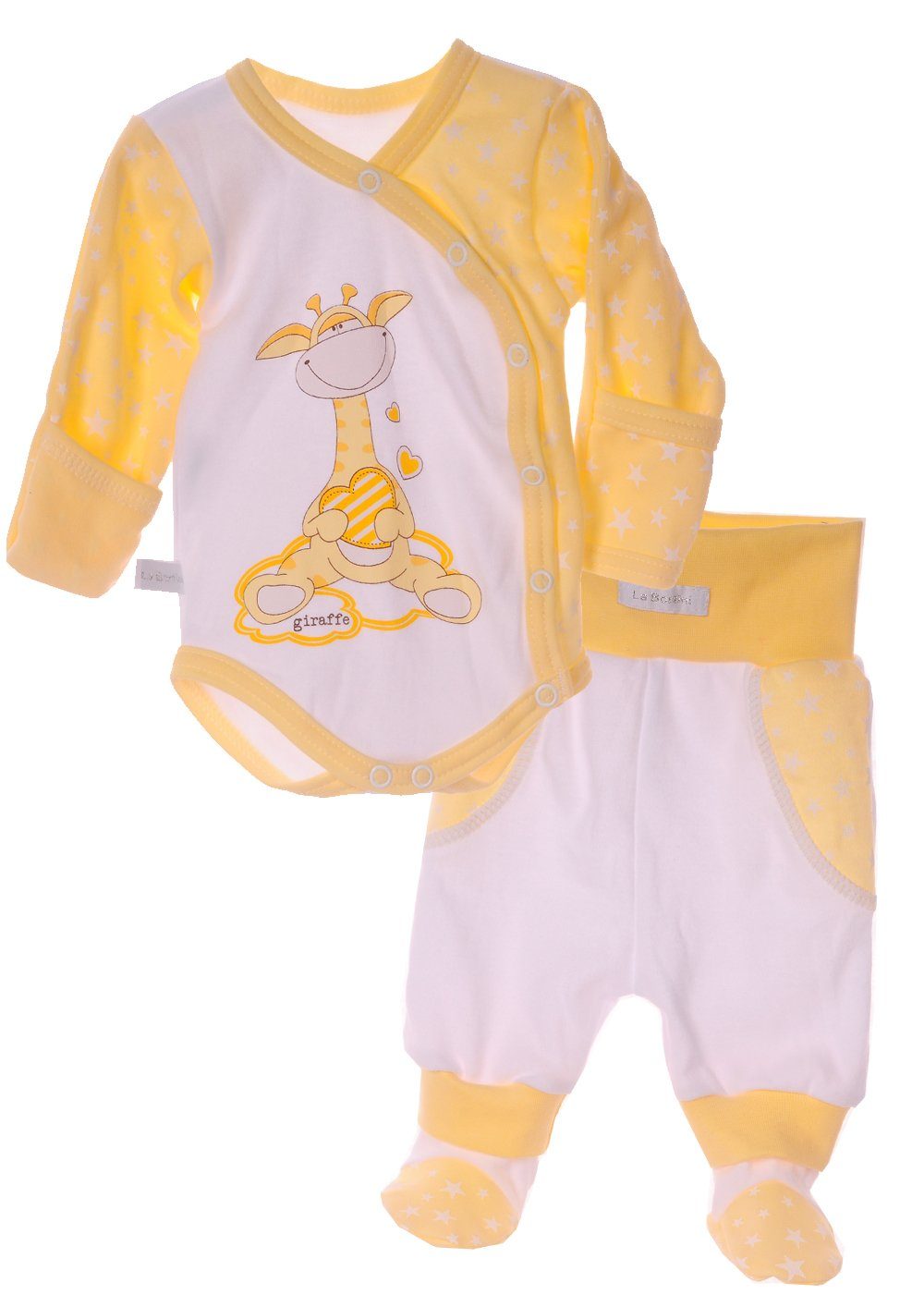 Dieser Wickelbody und die passende Hose bieten ein charmantes und praktisches Outfit für Babys. Der Wickelbody in Weiß und Gelb mit Sternchen Muster und einem niedlichen Giraffen Aufdruck ist aus reiner Baumwolle gefertigt, die sanft zur Haut ist und hohen Tragekomfort bietet. Die Wickeltechnik erleichtert das An- und Ausziehen und sorgt für eine bequeme Passform. Extra lange Ärmel und ein praktischer Kratzschutz schützen vor unangenehmen Kratzern. Die dazu passende Hose aus weicher Baumwolle mit Füßchen und einem elastischen, weichen Bund ergänzt das Set perfekt. Sie hält die Füße des Babys warm und bietet eine bequeme Passform, die mitwächst. Das unisex Design und die frischen Farben machen diesen Anzug ideal für Jungen und Mädchen und perfekt für alle Jahreszeiten. Ein stilvolles und komfortables Geschenk zur Geburt, Taufe oder für frischgebackene Eltern!