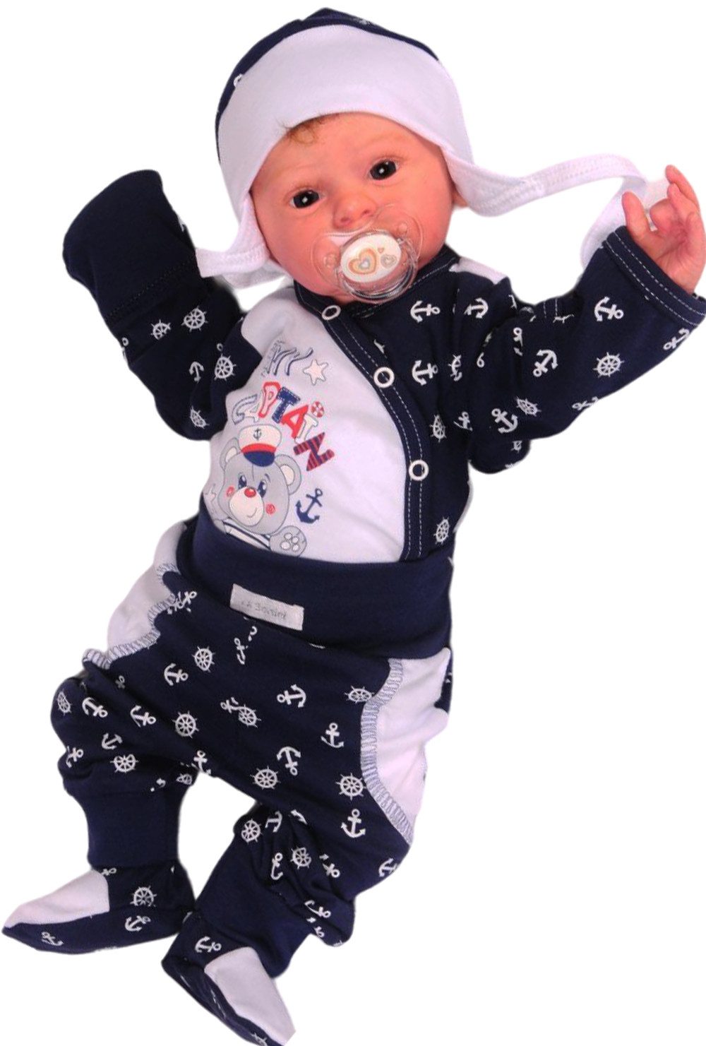 Entdecken Sie unseren 3-teiligen Babyanzug, perfekt für kleine Entdecker! Dieses Set besteht aus einem Wickelbody mit extra langen Ärmeln und integrierten Kratzschutz-Fäustlingen, verziert mit einem süßen Ankermuster und einem Bär-Kapitän Aufdruck in Weiß und Blau. Ergänzt wird das Set durch eine passende Hose und eine Mütze in Blau, beide ebenfalls mit Ankermuster gestaltet. Hergestellt aus reiner Baumwolle, bietet dieser Anzug höchsten Tragekomfort und ist besonders sanft zur empfindlichen Babyhaut. Ideal für alle Jahreszeiten, sorgt der Wickelbody für wohlige Wärme, während die Hose und die Mütze das Outfit perfekt abrunden. Ein praktisches und stilvolles Set für jeden Anlass – ideal als Geschenk oder für den täglichen Gebrauch!