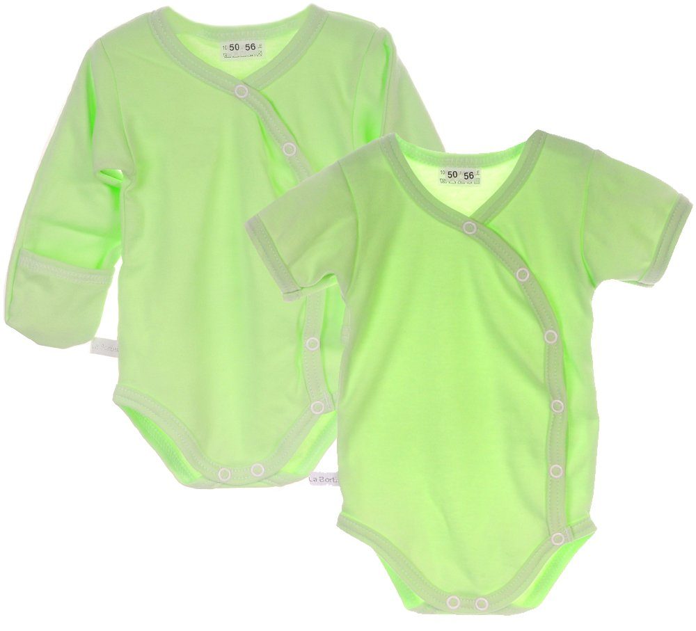 Dieser praktische 2er-Pack Bodys besteht aus einem Langarmbody und einem Kurzarmbody, beide in frischem Apfelgrün und als Wickelbodys gestaltet. Hergestellt aus 100% reiner Baumwolle, bieten sie optimalen Tragekomfort und sind besonders sanft zur empfindlichen Babyhaut. Die Wickeloptik ermöglicht ein einfaches An- und Ausziehen, was besonders im Alltag von Vorteil ist. Der Langarmbody eignet sich hervorragend für kühlere Tage, während der Kurzarmbody perfekt für warme Tage oder als leichte Schicht darunter ist. Dieses Set vereint Funktionalität und Stil und ist ideal für jede Garderobe Ihres kleinen Schatzes!