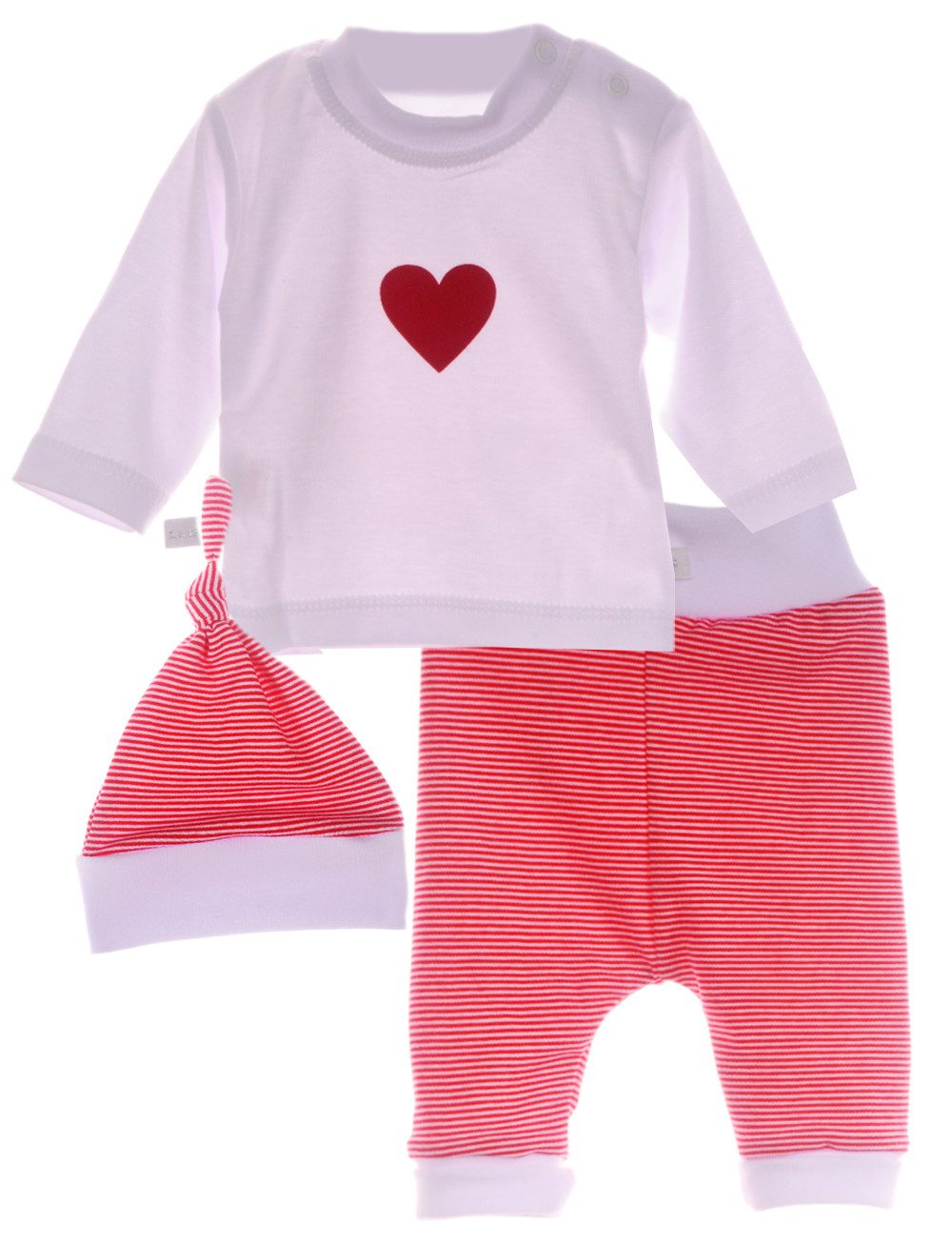 Baby Anzug 3-teilig – Langarmshirt, Hose & Knotenmütze (weiß-rot gestreift) Dieses niedliche 3-teilige Baby Set ist die perfekte Wahl für Jungen und Mädchen und eignet sich ideal als Geschenk zur Geburt. Das Set vereint hohen Tragekomfort, liebevolles Design und hochwertige Materialien – perfekt für alle Jahreszeiten, inklusive der festlichen Weihnachtszeit. Das Langarmshirt in klassischem Weiß ist aus 100 % Baumwolle gefertigt und besonders sanft zur empfindlichen Babyhaut. Ein zarter Herzchen-Aufdruck verleiht dem Shirt einen verspielten, kindgerechten Look. Die passende Hose und Knotenmütze im weiß-rot gestreiften Design bestehen aus einem weichen Baumwoll-Elasthan-Mix (95 % Baumwolle, 5 % Elasthan). Bund, Bündchen und das elastische Material sorgen für einen bequemen Sitz und optimale Bewegungsfreiheit. Die Mütze mit Knotenabschluss schützt das Köpfchen und rundet das Outfit liebevoll ab.