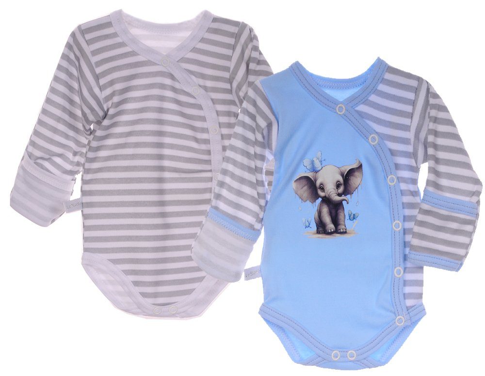 La Bortini Wickelbody 2er Body Langarmbodys Body in Blau mit Elefant gestreift aus reiner Baumwolle, 44 50 56 62 68 74 80 86 92 98 104