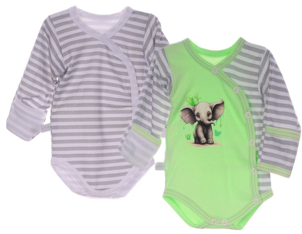 La Bortini Wickelbody 2er Pack Langarmbodys Body Grau gestreift Grün mit Elefant aus reiner Baumwolle, 44 50 56 62 68 74 80 86 92 98 104