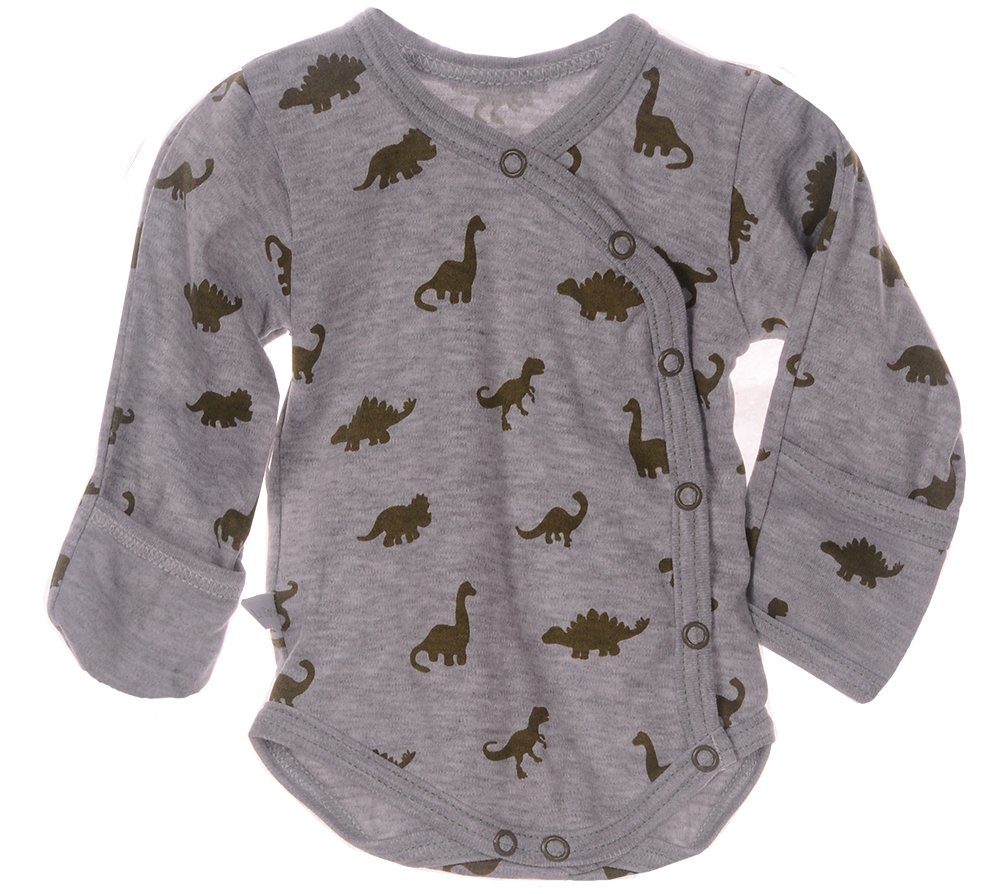 Dieser Wickelbody ist ein praktisches und komfortables Kleidungsstück für Babys und Kleinkinder. Hergestellt aus reiner Baumwolle, bietet er sanften Schutz und hohen Komfort für die empfindliche Babyhaut. Der Body in Grau mit Dinos-Muster ist besonders weich und atmungsaktiv, ideal für den täglichen Gebrauch. Mit extra langen Ärmeln und einem Kratzschutz bietet er zusätzlichen Komfort und Schutz vor scharfen Fingernägeln. Der Wickelbody lässt sich einfach an- und ausziehen, was das Leben von Eltern erleichtert. Ein einteiliger Body, der Komfort und Stil vereint – perfekt als Geschenk zur Geburt oder für jeden Tag!