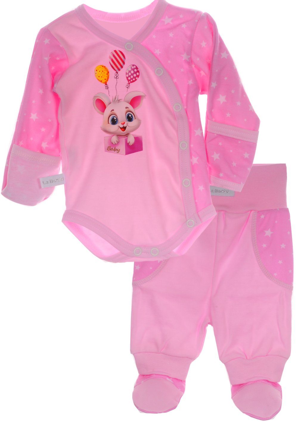 Dieser süße 2-teilige Baby-Anzug in Rosa besteht aus einem langärmeligen Wickelbody mit extra langen Ärmeln und Kratzschutz sowie einer passenden Hose mit Füßchen und weichem, elastischem Bund. Aus reiner Baumwolle gefertigt, ist das Set hautfreundlich und atmungsaktiv und somit ideal für die empfindliche Babyhaut. Das liebevolle Sternchenmuster und der niedliche Hasen-Aufdruck verleihen dem Anzug einen besonderen Charme. Ein perfektes Set für Neugeborene, das kuschelig, komfortabel und ideal als Geschenk zur Geburt ist!