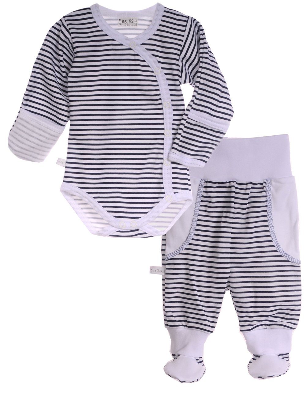 Entdecken Sie unseren Wickelbody in Weiß-Blau gestreift, perfekt für alle Jahreszeiten. Der Body verfügt über extra lange Ärmel und einen integrierten Kratzschutz, der die empfindliche Babyhaut schützt. Dank des praktischen Wickelverschlusses lässt er sich leicht an- und ausziehen. Dazu gehört eine weiche Hose mit elastischem Bund und Füßchen, die zusätzlichen Komfort und Wärme bietet. Beide Teile sind aus 100% reiner Baumwolle gefertigt, was für ein angenehmes Tragegefühl sorgt. Dieses Set ist ideal für den täglichen Gebrauch und hält Ihr Baby gemütlich und bequem gekleidet.