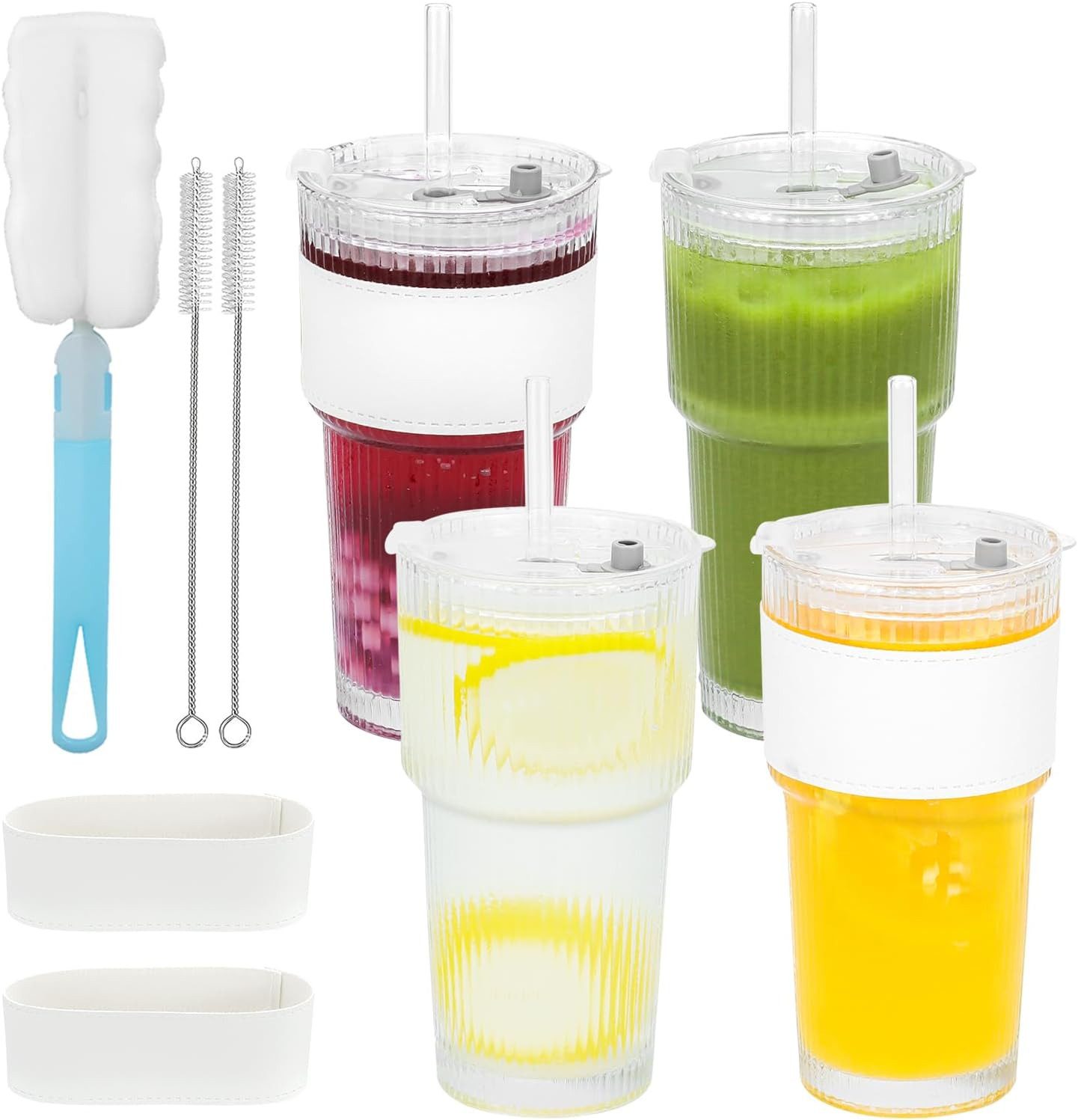 Das Feelhap Trinkgläser-Set mit 4 hochwertigen Gläsern à 600 ml inklusive passender Deckel, wiederverwendbaren Glasstrohhalmen und eleganten Ledermanschetten ist der perfekte Begleiter für erfrischende Getränke zu Hause, im Büro oder unterwegs. Ob Smoothies, Eiskaffee, Saft oder Cocktail – diese robusten Gläser bieten dank ihres modernen, gestreiften Designs und der komfortablen Размер höchsten Trinkgenuss mit Stil.