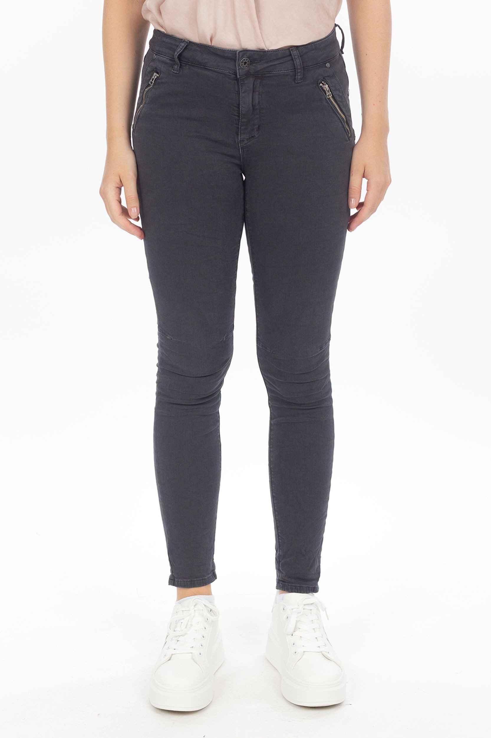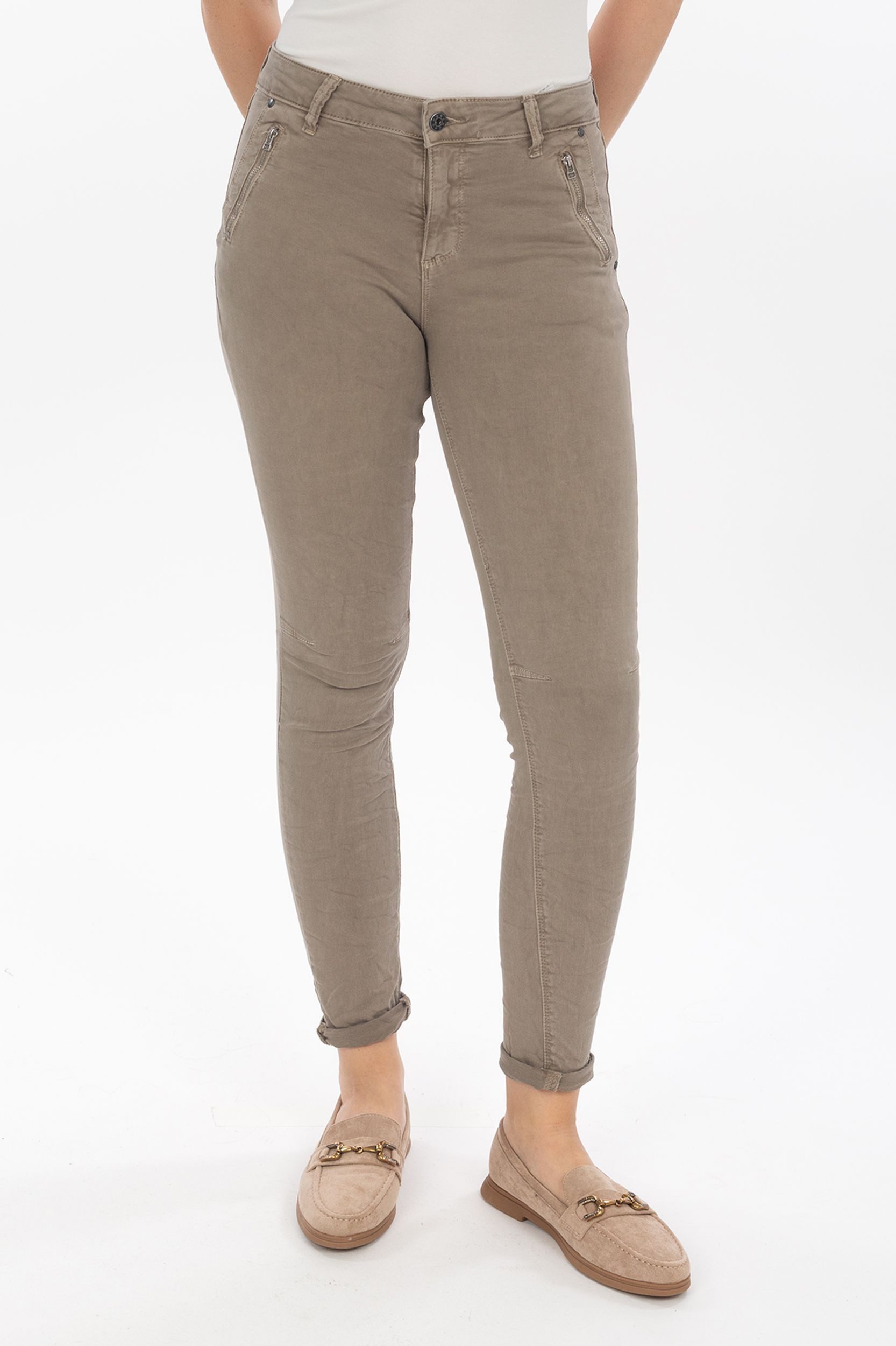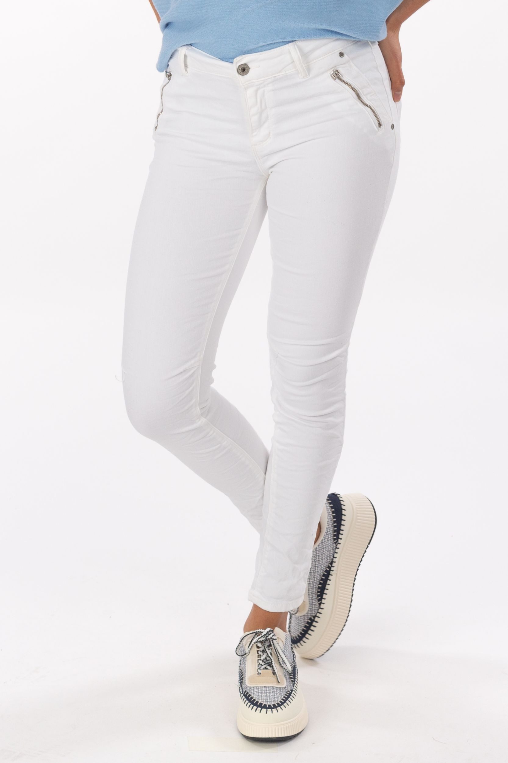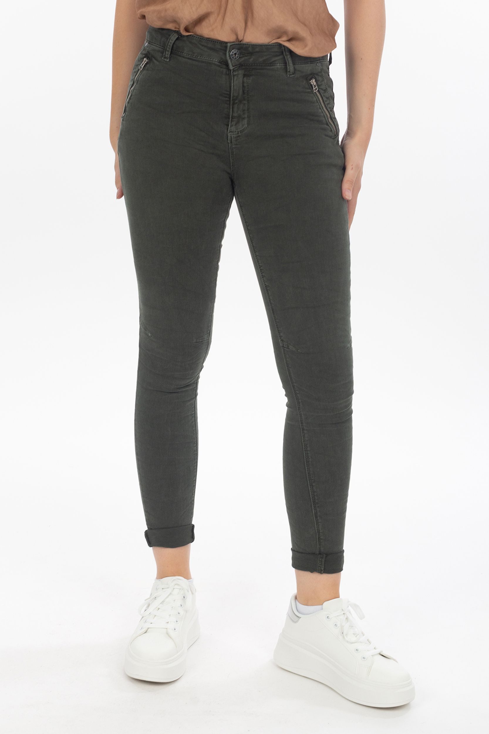 Diese Skinny Crinkel Hose mit einer Mid-Rise Bundhöhe ist eine eng anliegende Hose, die knapp über der Hüfte sitzt. Sie ist aus einem dehnbaren Material gefertigt, das sich angenehm an den Körper anschmiegt und eine figurbetonte Passform bietet. Die Hose ist mit Gürtelschlaufen ausgestattet, sodass ein Gürtel nach Belieben getragen werden kann, um den Look zu individualisieren. Die Hose hat Taschen mit Reißverschlüssen an den Seiten, die nicht nur praktisch sind, um kleinere Gegenstände sicher zu verstauen, sondern auch einen modernen Akzent setzen. Auf der Rückseite befindet sich Gesäßtaschen. Durch den Crinkel-Effekt erhält die Hose eine leicht geknitterte Optik, die sie besonders interessant und modern wirken lässt. Die Hose ist sowohl für den Alltag als auch für schickere Anlässe geeignet und verleiht dem Outfit eine modische Note.