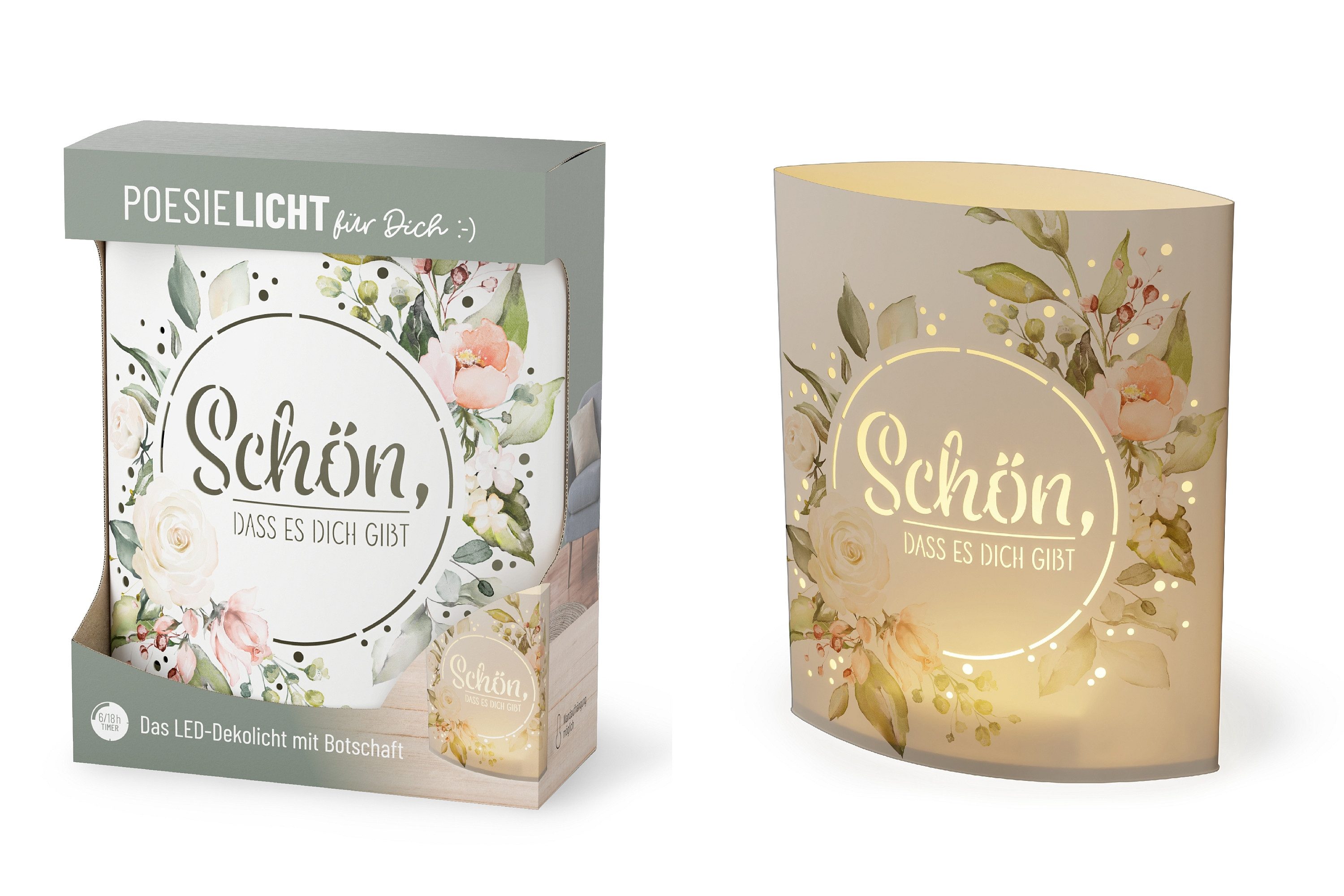 Das Poesielicht für Dich :-) verzaubert mit poetischen Sprüchen und fröhlichen Motiven. Verleihe Deinem Zuhause eine einzigartige Atmosphäre, schaffe Lichtmomente und setzte Botschaften. Das Poesielicht für Dich ist das perfekte Geschenk für besondere Momente! Es kann sowohl hingestellt als auch an die Wand gehängt werden. Eine praktische Timer-Funktion und eine schützende Geschenkverpackung aus Karton runden das neue Licht ab.